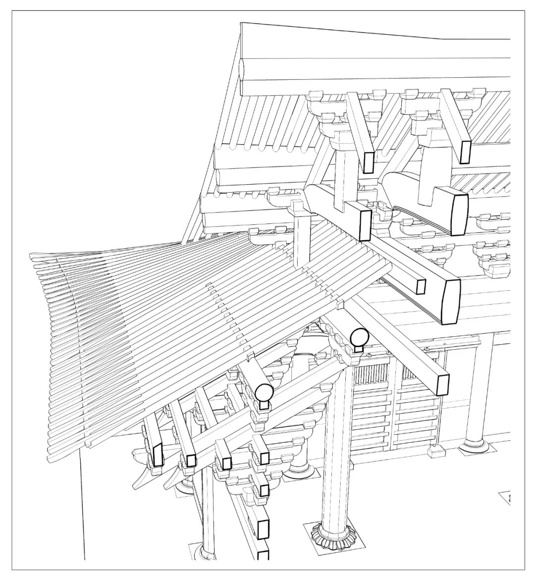 歇山构架的特点在于转角做法,即《营造法式》所谓转角造,指梢间椽架转过90度的构造做法,而角梁转过的椽数则是转角做法上的一个重点。