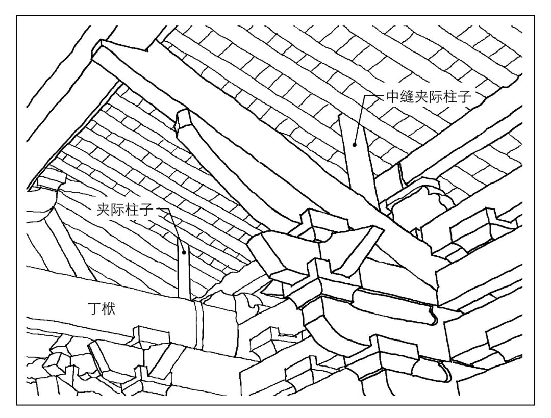 凡殿阁出际尺寸偏大时,于山面梁架外侧丁栿上别立夹际柱子,以支承出际悬挑的槫梢。又因只是作为辅助支承构件,故夹际柱径应稍小。