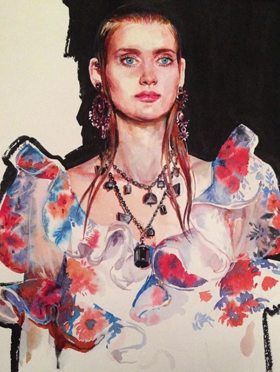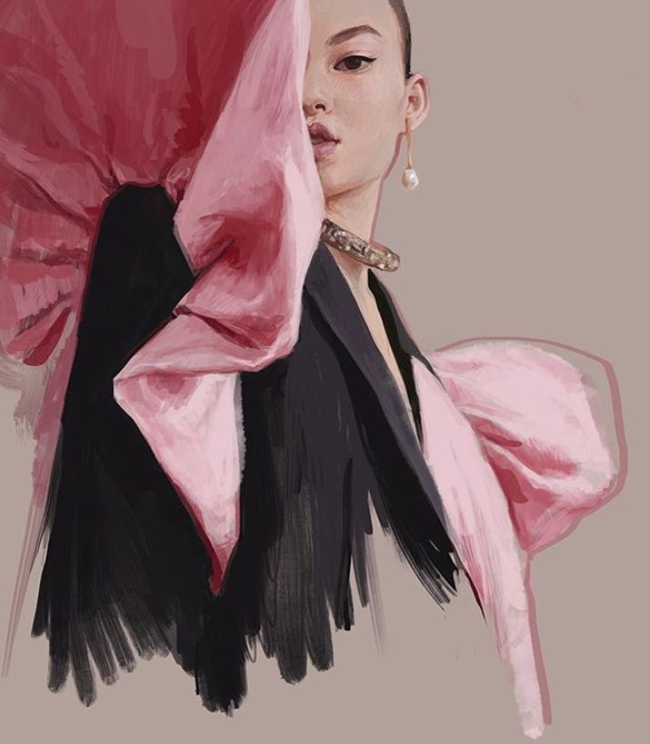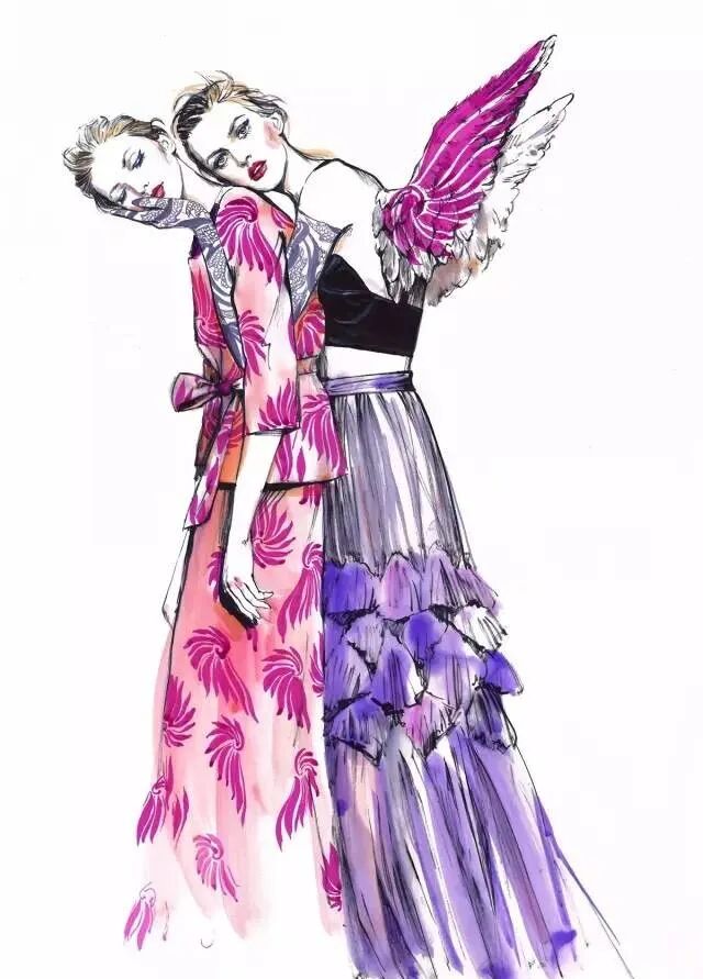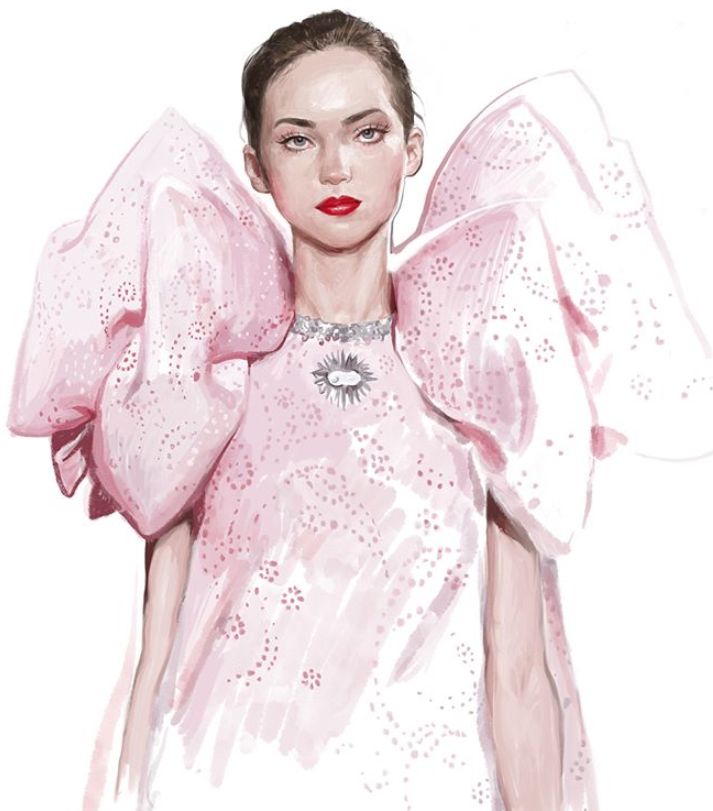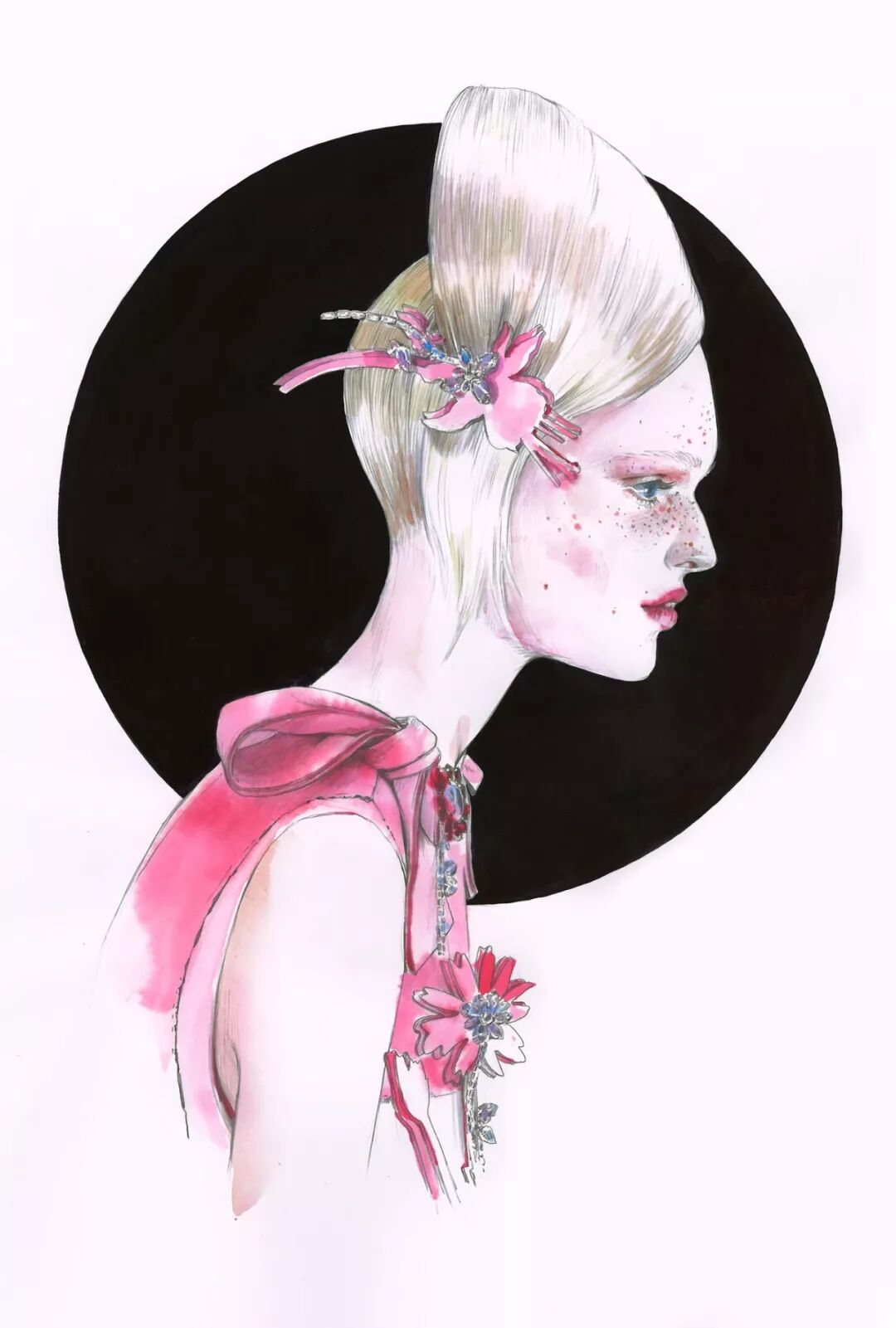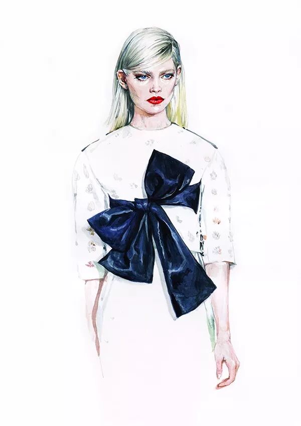 Diana Kuksa钟爱描绘Giambattista Valli,Victor & Rolf ,Thom Browne等品牌的时装作品,她的刻画往往虚实有度,透露着一股灵气,写实又烂漫。