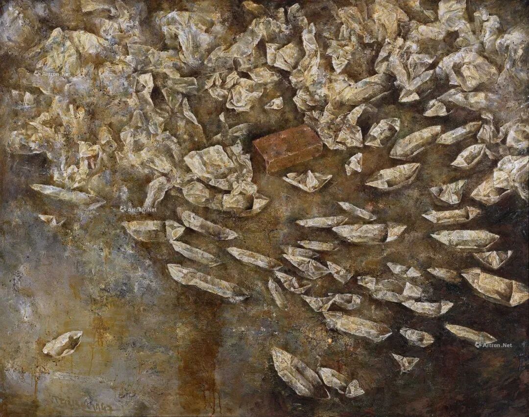 “陈文骥是中国当代美术史中不可忽略的艺术家,他的艺术探索与风格转型历程是一个特立独行的案例,由具象转到观念性抽象。《不沉的纸舟》是市场难得一见的陈文骥九十年代的精品。它延续了之前创作中与‘不入画’的景物对话,带有很明显的个人的忧郁、自闭的情绪,并试图用一种直观而细碎的事物描绘,形成一股以沉静内敛为特征的视觉力量。荒诞如梦境中堆叠的纸舟之下,涌动着繁杂不安的情绪,折射出同一时期现实生活的荒诞和茫然。”