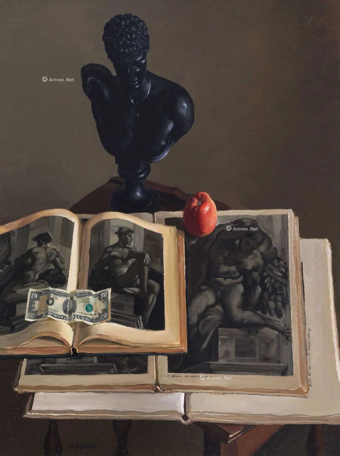 “陈丹青老师《西藏组画》早成为上世界70、80年代交替时期中国写实主义的代表作,早就让绘画从当时的政治主题系统中,逐渐走向人性真诚的震撼表达,并且在细腻丰富的色彩关系与空间塑造中,让中国油画的绘画方法,不再仅仅是间接学习前苏联的粗迈宣传单一样式。而这件《亚当苹果和美元》也是他继《西藏组画》后不久去美国不断探寻绘画艺术新发展新可能时期的一件重要力作。我曾有机会给陈丹青老师组织策划展览,也和他聊起为什么后来开始画画册系列,他开玩笑和我说,因为他不知道画什么所以就开始画桌子上放置的画册了。他其实是在思考每一个画家的绘画经验是否都来自二手?另外也能感觉到他在美国看多了各种艺术表达,开始对过去传统的写实油画强烈的情感叙事方式和主题创作的一种质疑与突破,以一种自然的画家日常生活场景为绘画对象,没有意义此刻可能就成为意义。《亚当苹果和美元》画面中不经意的画册和雕塑,和搁置在桌面上的美元、苹果又形成一种看似没有关联但有意味隐喻的相互关系,可以看到,这件作品陈丹青老师早期扎实朴素的油画写实功力和张力,并没有再次激扬起对宏大叙事的过度热情,反而是以一个画家的日常生活场景入画,让我们感受到画画就是画画,感受到单纯画画带来的无穷艺术魅力。”