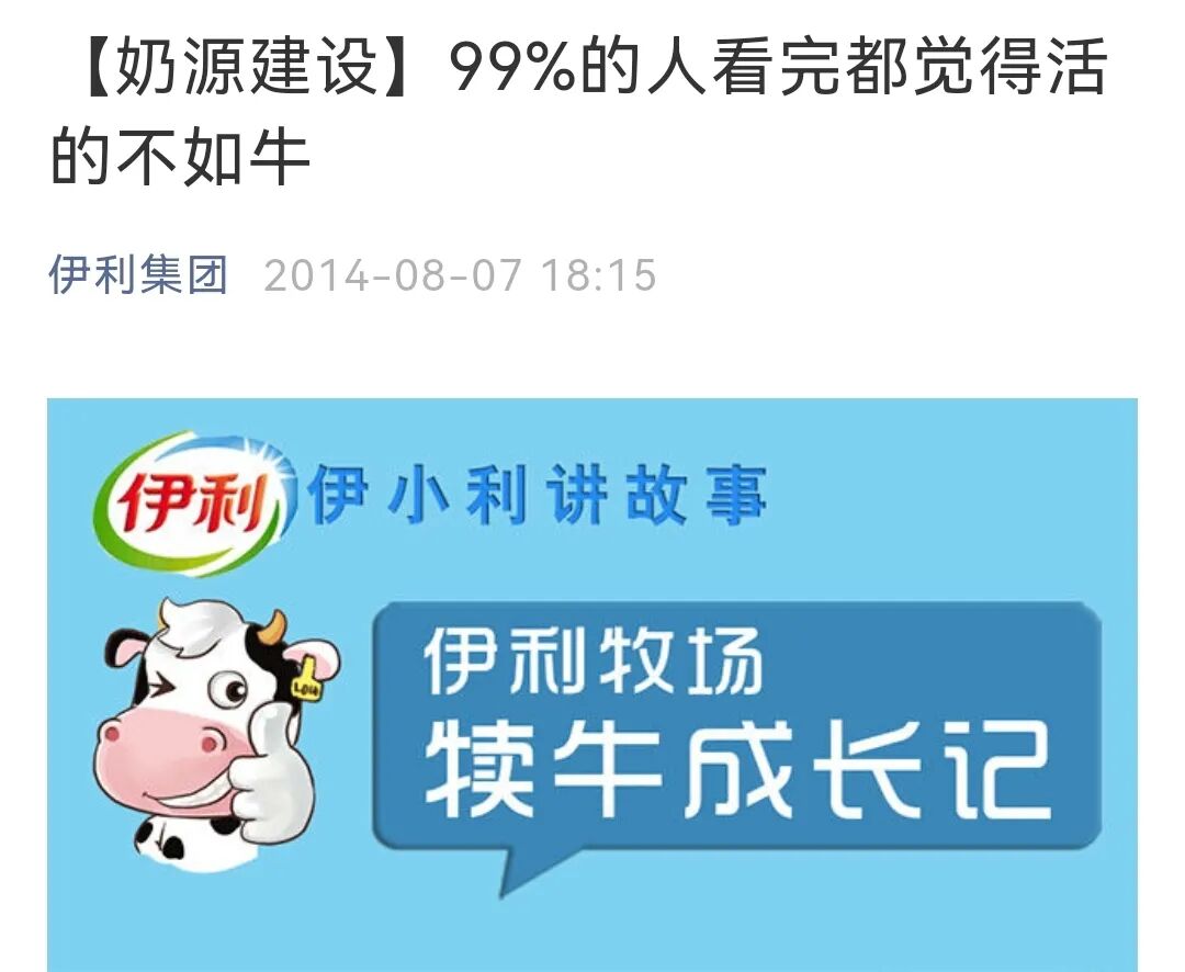 此外,胖鲸特就以伊利为首的传统乳企在奶源、生产过程等方面的举措进行过相关查询。结果发现,优质奶源及透明化生产过程早已不是新鲜概念。就连认养一头牛作为主要宣传点的“人活得不如牛”,即所谓“心情好、吃得好、住得好、工作好、出身好”这五好概念,伊利也早在2014年就有所宣传。简言之,从牧场、奶牛,再到产品,认养一头牛所提出的概念在中国乳业当中,并不新鲜。