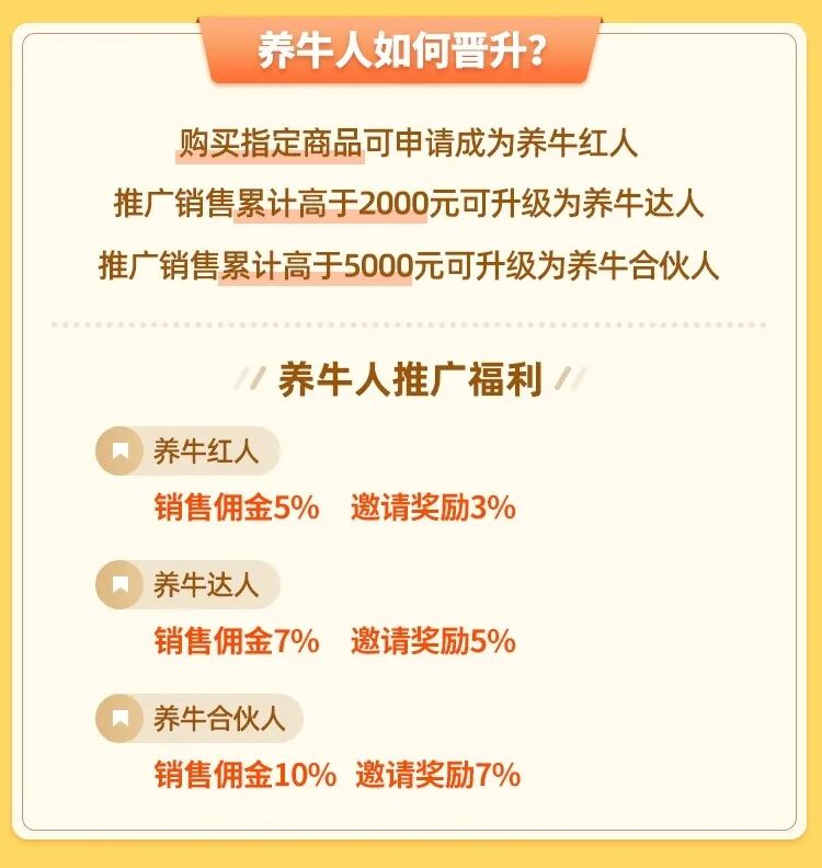 其次,所谓“认养模式”亦被业界指出,类似于“变相拉人头卖会员卡”。这一质疑并非空穴来风。此前,伴随着“认养合伙人”一并提出的,还有分销员的概念。“当用户推广销售累计高于2000元可升级为养牛达人”、“邀请好友加入团队,可获得3%-7%的佣金”。上述策略与一度盛行的微商模式,在操作层面上别无二致。