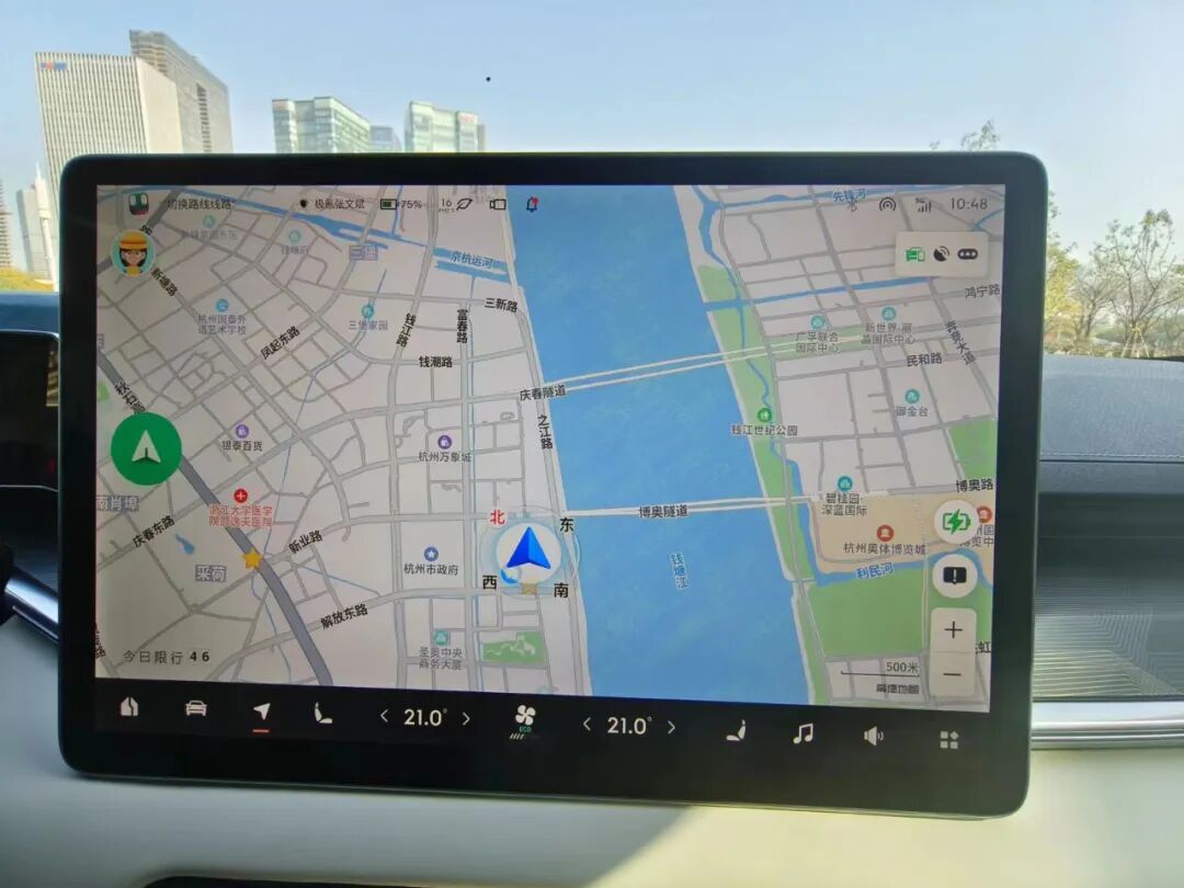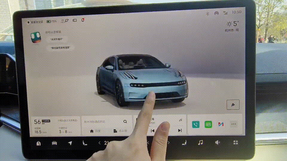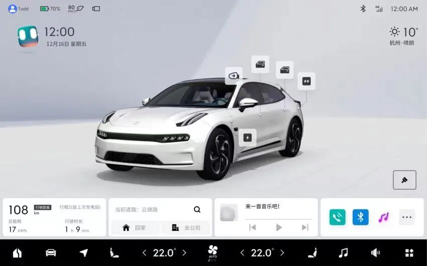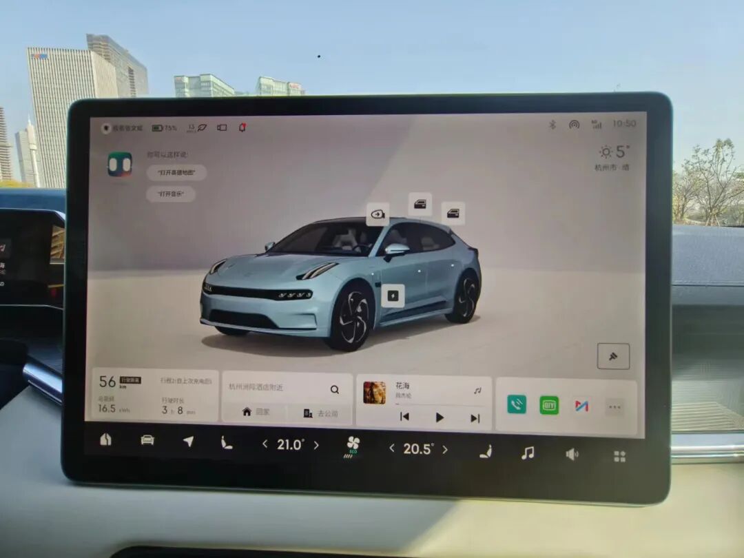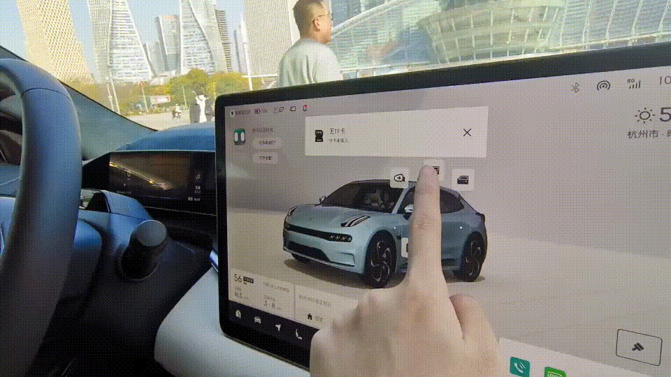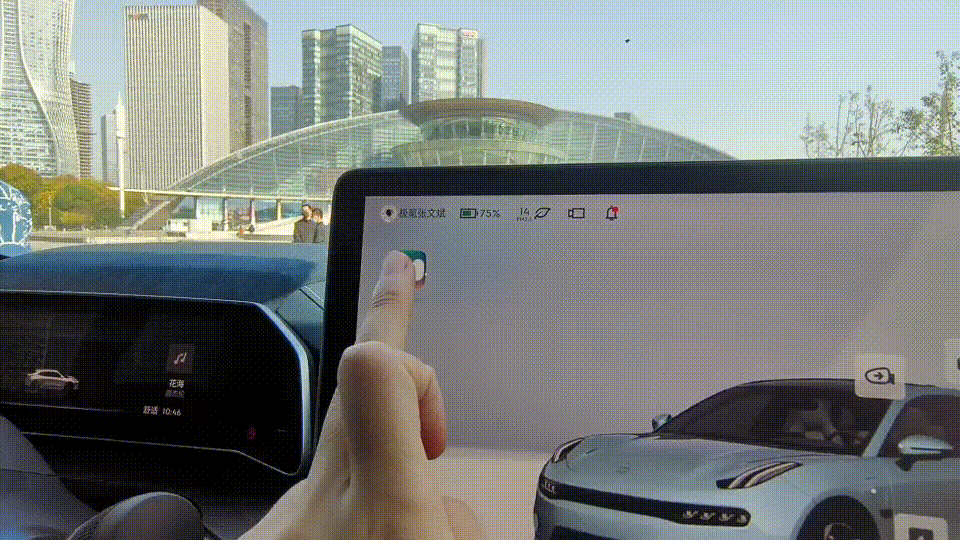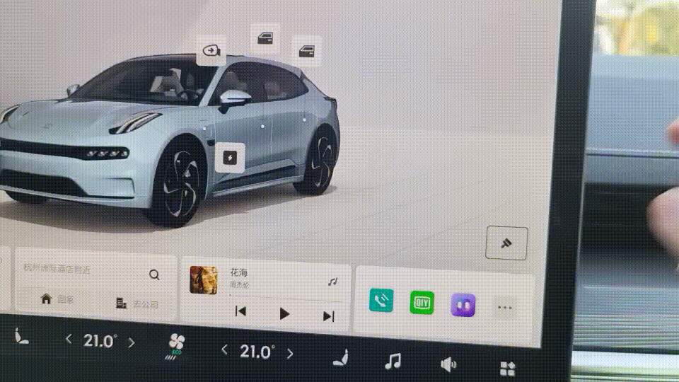 ZEEKR OS 4.0使用了全新HMI设计,中控屏主页面设置成了3D座驾的场景模式,挂D档则自动切换为地图。