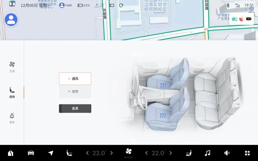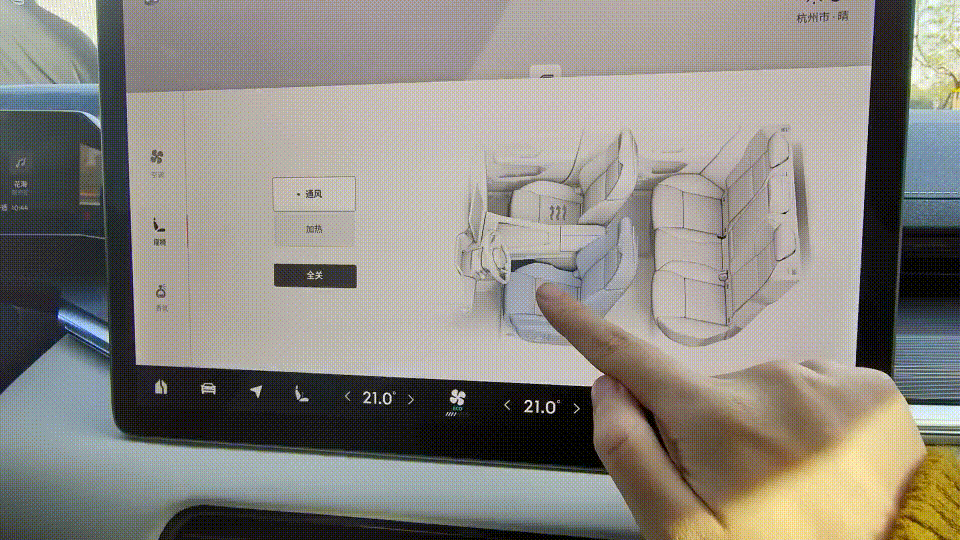 座椅使用3D渲染技术让调节更简易便捷,加热通风的调节按钮就集成在相应座椅调整的区域位置,动效实时反馈调节情况。