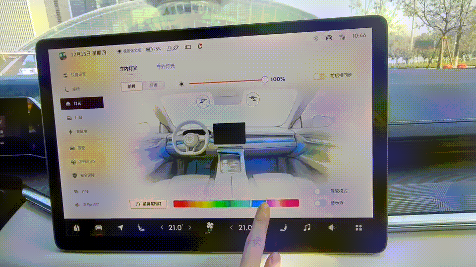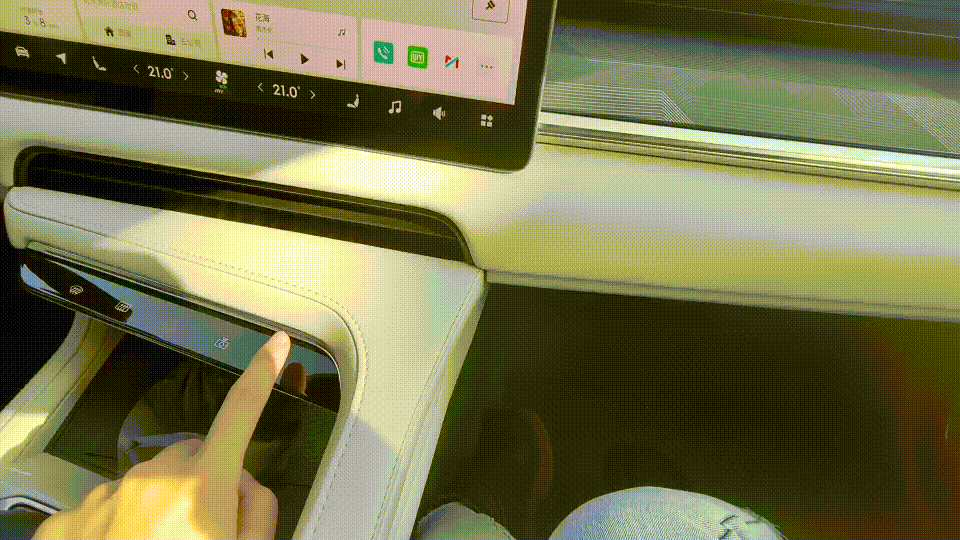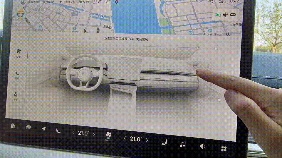 空调可以进行不同区域的独立开关和风向控制,通过触碰屏幕里相应的位置,就能满足主副驾的不同需求。