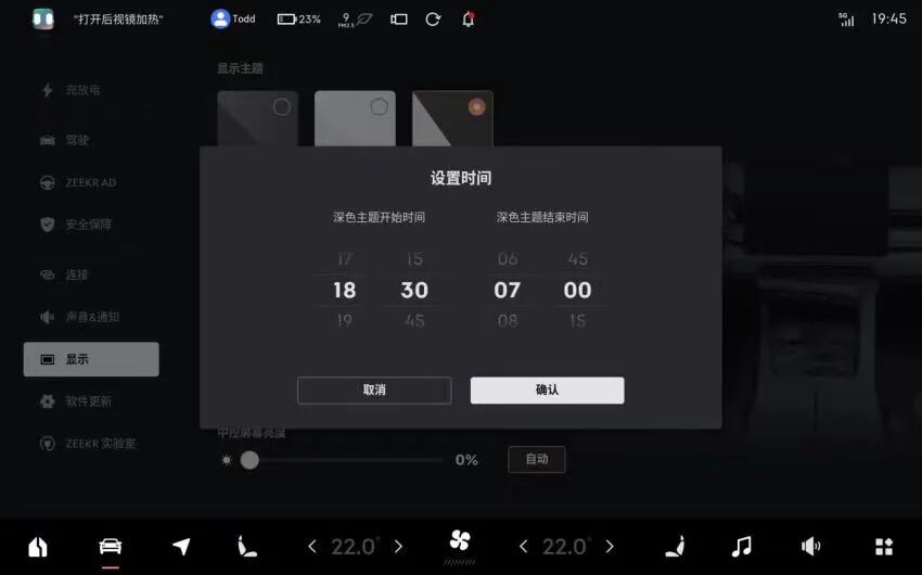 屏幕可以设定时间来自动切换为深色/浅色模式,比如将白天时间设置为7-18点,那么这个时间段中控屏会显示浅色模式,其余时间段屏幕会自动切换为深色模式。