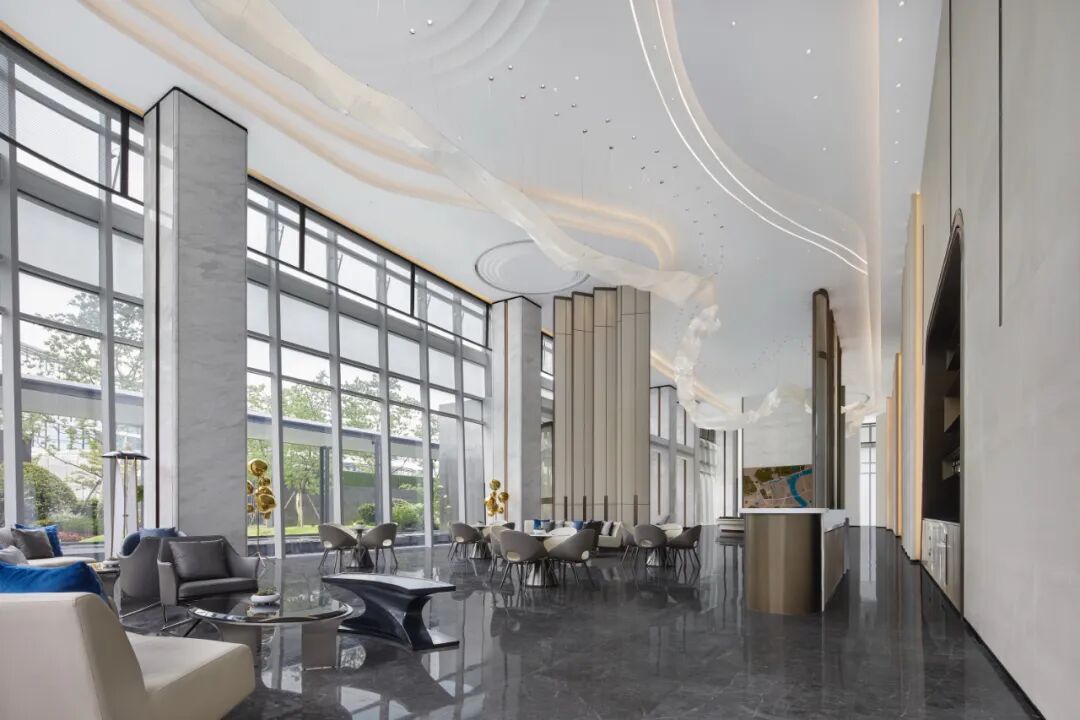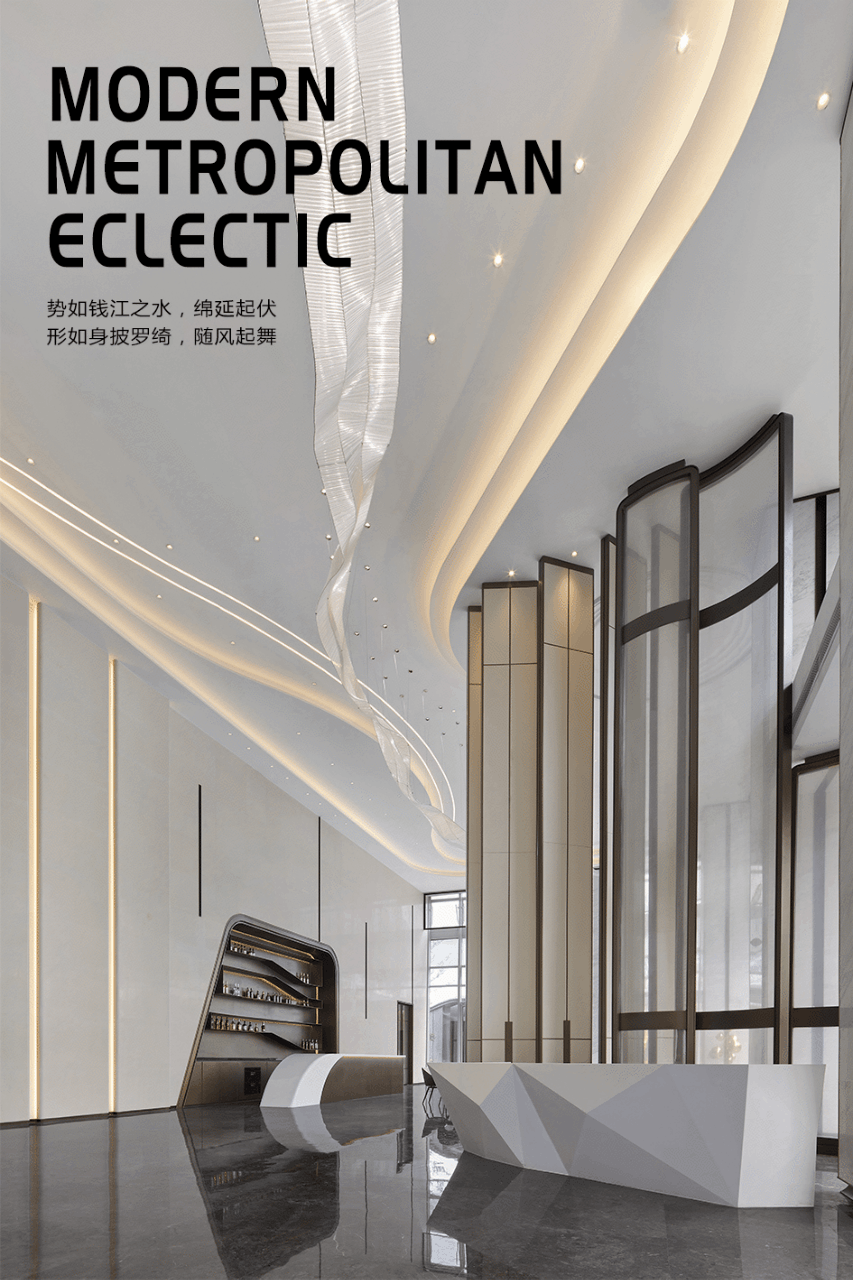 坐拥秀丽的自然风光,室内8米的挑高空间,大面水晶砖、夹丝玻璃、自然砂岩和爵士白大理石的组合运用,是经典与艺术的碰撞,宛若山川跌宕起伏,酣畅恢宏。“之”字形水晶挂饰灯,以之江的“之”为灵感,让整个空间活跃起来,串联起售楼处的接待区、沙盘区、洽谈区、VIP区水吧区、文化体验馆等,一如起伏绵延的钱塘江水,翻滚涌动;又如江南轻柔的罗绮,随风起舞。虚实相应,妙趣横生,无声却庄严的表达着时代下的“秩序感”。
