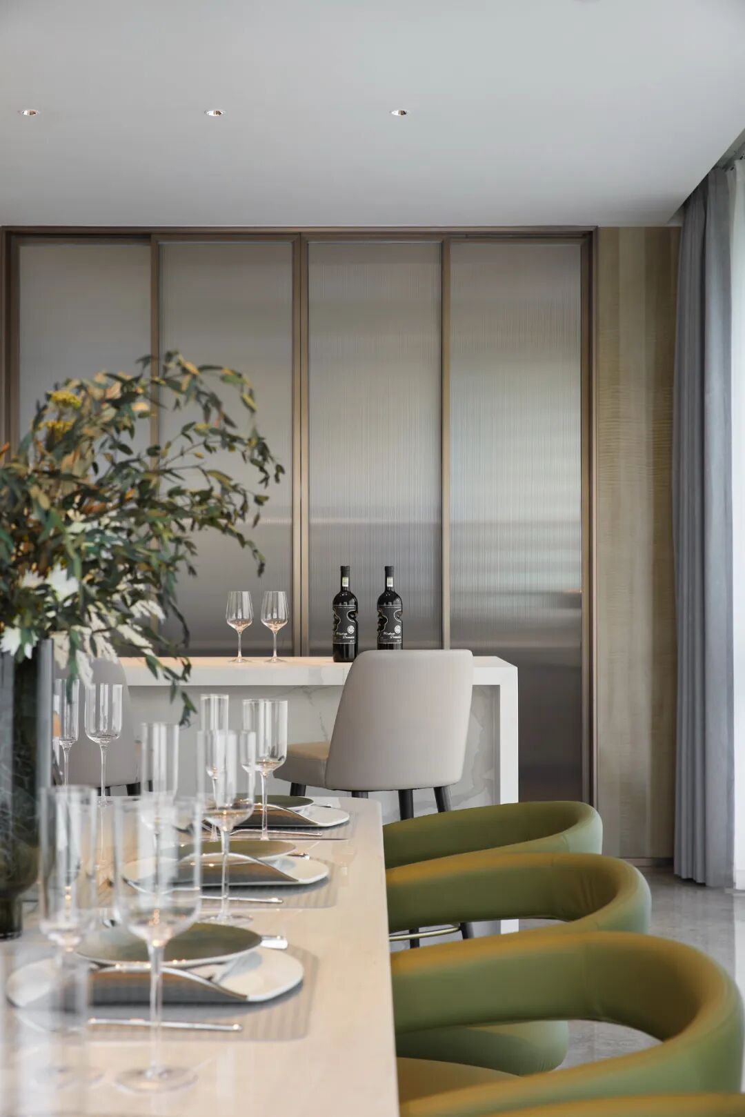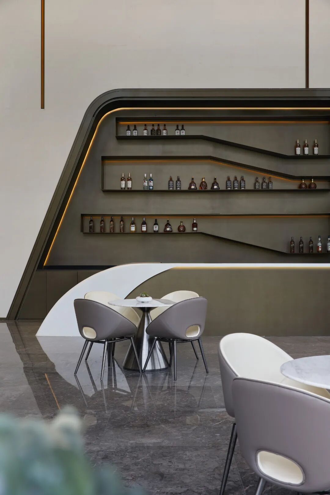 越过山峦,便是视野开阔的闲暇圣地——洽谈区,由三组弧形沙发环绕出整个空间的围合感,拟湖面的天花造型,柔风吹来,“罗绮”轻舞飞扬。大幅落地玻璃围绕,远处的“新绿”投入眼帘不觉让人“上岸”共饮一杯。苍劲线条打造的酒架,配上金属质感加持,都市繁华的倒影将原本干净、简约的空间里注入了人气、活力。