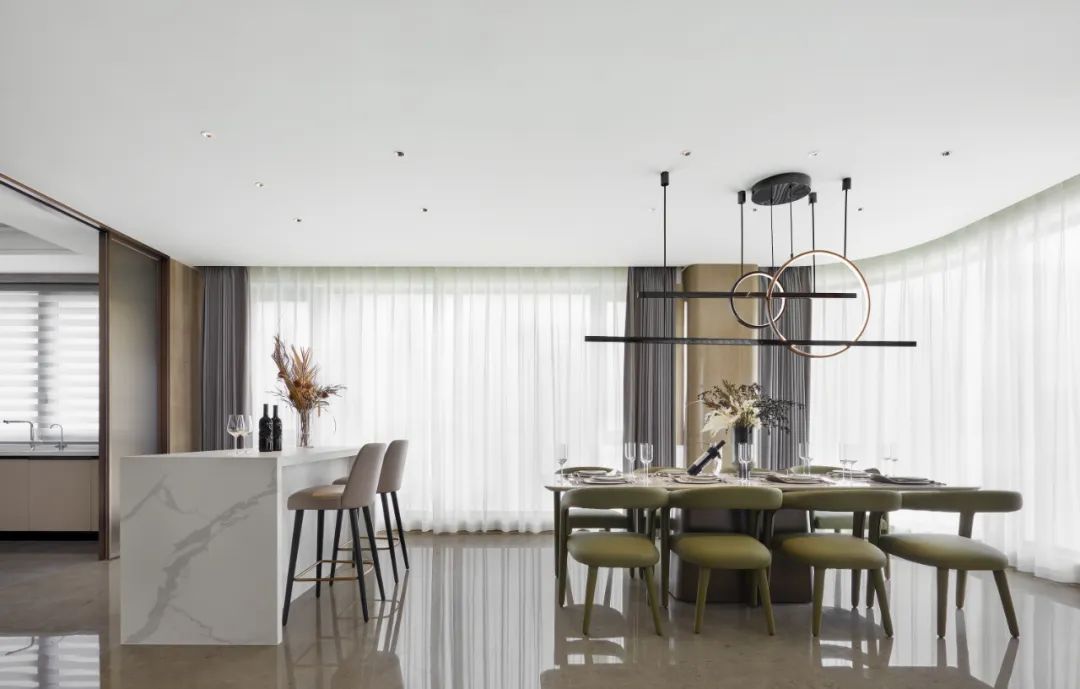 该户型最大的亮点,在于实现了动静空间的分割。一边是公用的客餐厅和多功能厅,另外一边是卧室。多功能房可做茶室、书房、瑜伽房,也实现了与客餐厅的动静分离。近100平米的客餐厅,是开 Party 的理想场所,亦可用来做沙龙、家庭轰趴、宴请宾客等,满足当下都市人的多种需求。