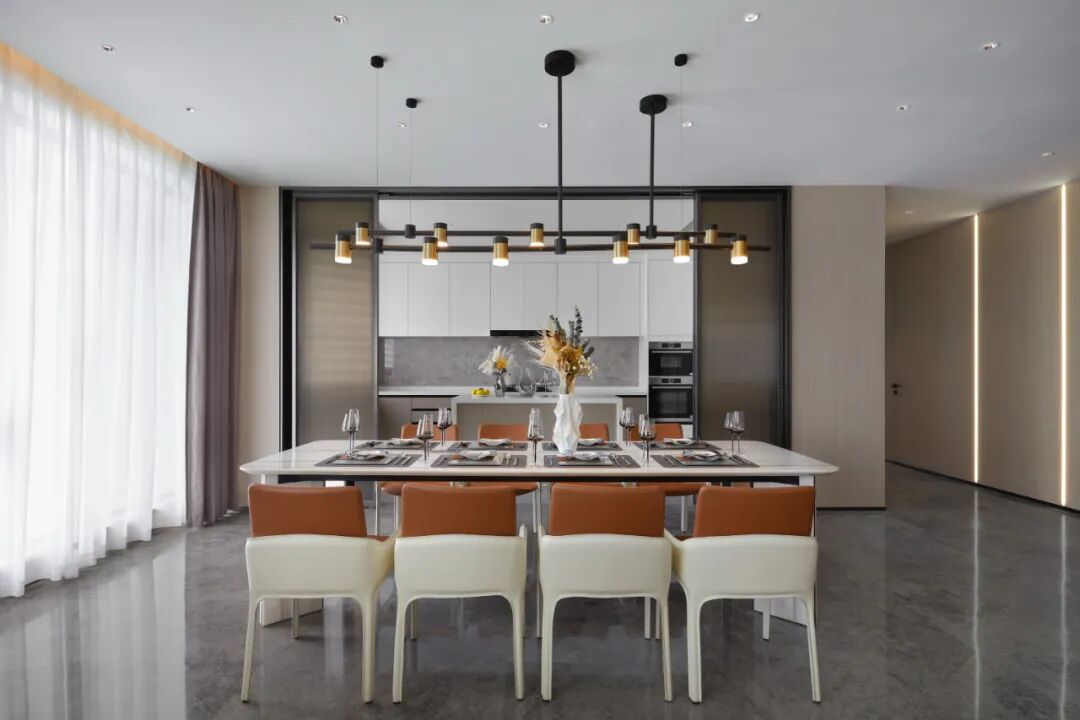 客餐厅270°的宽幕视野,目之所及,内外皆景。偌大开阔的空间,以自然书香形式展开,大小各异的“方形”元素配上不同材质不同颜色各就其位将“秩序感”表达的淋漓尽致。天花直白有力的方正感增加了整个空间的张力,高定皮革组合,融入金属细节配合,奢阔尺度结合,重塑具有国际化都会精英的品质生活。
