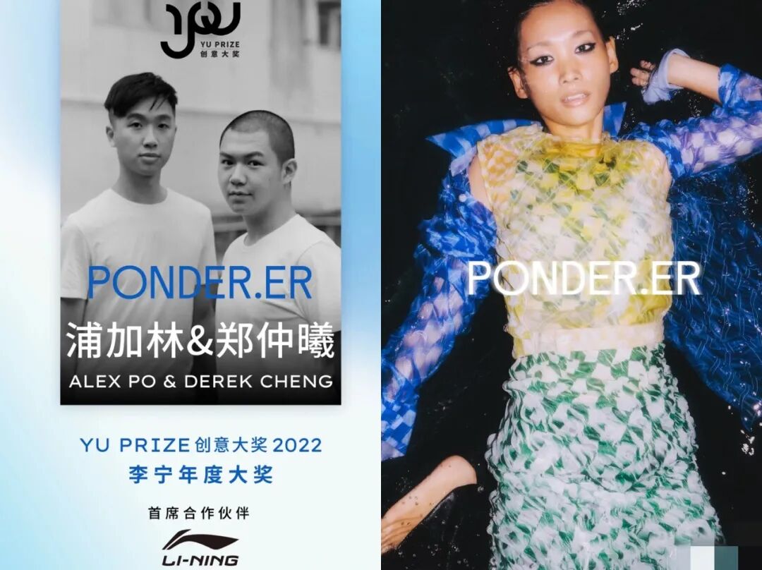 2022 年 6 月 17 日至 19 日,由 Yu Holdings 创投机构主办,上海时装周、法国高定时尚联合会(FHCM)联合呈现的 Yu Prize 创意大奖 2022 正式官宣获奖名单,并通过首季数字上海时装周官方日程全球首发。本季YU PRIZE创意大奖李宁年度大奖由品牌PONDER.ER的两位设计师浦加林和郑仲曦获得。陈盛韬(Louis Shengtao Chen)、郭一然天(YIRANTIAN)、李浩冉&瞿思颖(PRIVATE POLICY)、聂若涵(RUOHAN)、黄强(Victor Wong)获得YU PRIZE创意大奖创意星光,而新声奖被以独特设计征服众星的设计师韩宇晨(AlienAnt)收入囊中。