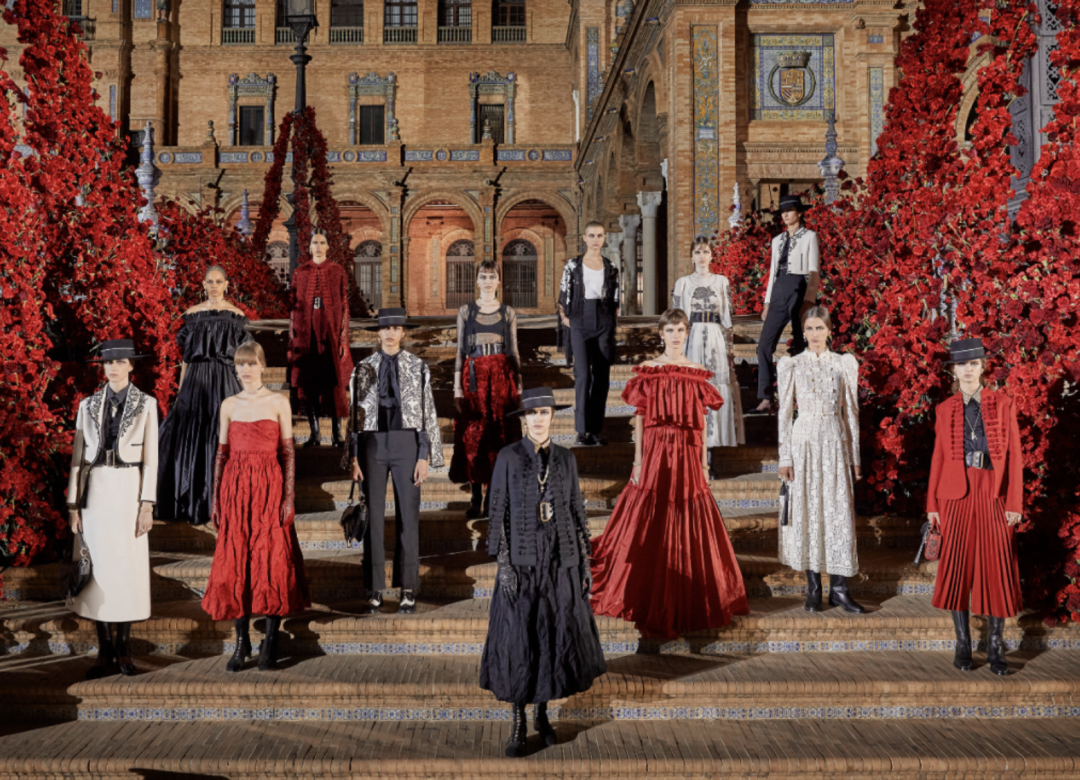 Dior 在西班牙塞维利亚西班牙广场(PLAZA DE ESPAÑA)举办 2023 早春女装时装秀。Dior 女装创意总监 Maria Grazia Chiuri 以享有“首席”(LA CAPITANA)之称的西班牙艺术家 Carmen Amaya 为灵感缪斯之一,续写品牌与西班牙之间的故事新章。本季造型亦呼应传奇女性阿尔巴公爵夫人(Duchess of Alba)与美国前第一夫人 Jackie Kennedy 相伴骑马的经典时刻,杰奎琳以短款夹克、高腰裤装搭配斜戴宽檐帽的造型成为佳话。她巧妙结合红黑双色,并以西班牙式披肩头纱为巧妙点缀。此外,本季造型亦以马卡雷纳圣母( Madonna Della Macarena)长袍礼服上的繁复精美刺绣为灵感,透过摩登化的演绎,将神圣端庄的气质勾勒成优雅独立女性形象。
