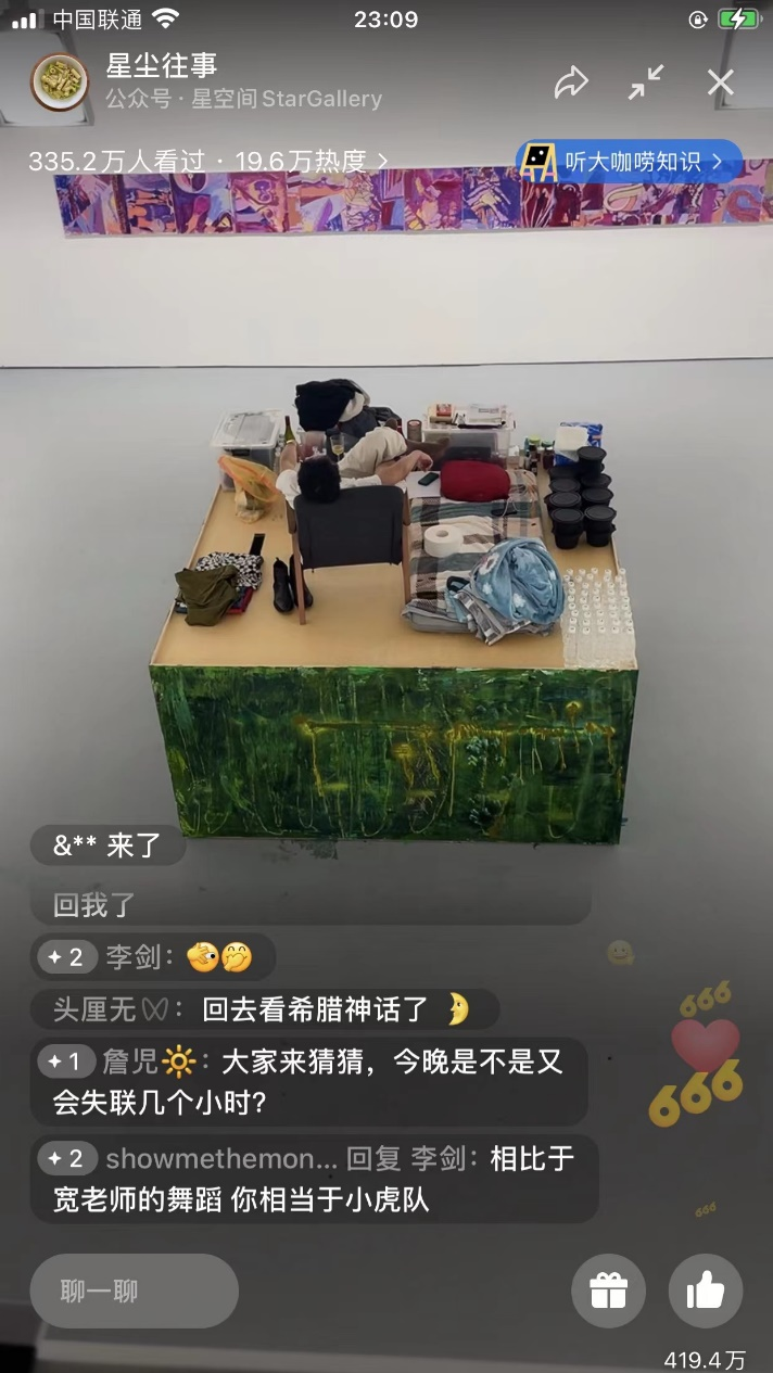 艺术与设计的差异就在于此——艺术挖掘过程的意义,而设计只在乎结果。我想庞宽应该对此并没有一个明确的认识。因为如果有的话,他可以在这个过程中做很多有意义的,至少是更有趣的事情,比如在睡觉的时候脱掉自己的一些衣服,比如和观众进行一些更有意义的互动(目前他与观众的互动几乎没有),再比如利用他在这个空间中的特殊的情绪来进行一些创作行为,或者朗诵一些内容……在无数可以做的事情里面,庞宽却选择听音乐,然后百无聊赖地坐着。