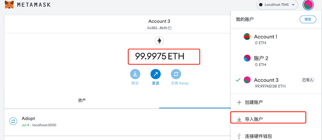 创建新用户,并使用Ganache中其中一个地址的私钥导入账户,导入成功就会发现有免费的100ETH可以进行交易。