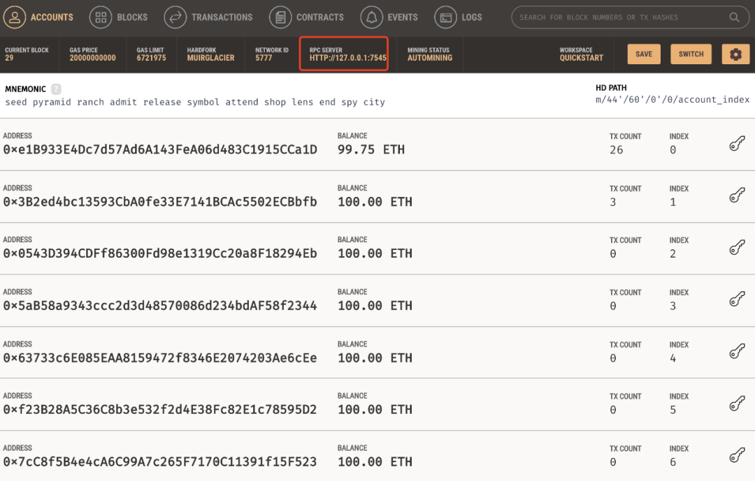 Ganache中可以免费提供10个账号,分别记录了各自的地址以及余额,并且需要关注RPC SERVER的地址。