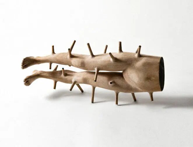 从那一刻开始,木材就成了他雕塑作品中不可或缺的材料之一,在这组名叫蜕变的雕塑中,这位艺术家同样采用的是木材去制作雕塑作品,这组雕塑作品虽然是一组超现实作品,不过并不难看懂,雕塑家制作出一个个人体的局部,像是双手、脚部和胳膊等位置,在这些局部位置上,艺术家又进行了加工,这些木头制作的手和叫上都长出了尖刺,或者是被一些尖刺刺穿。