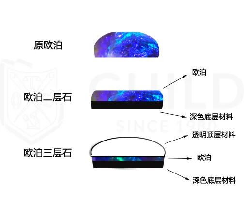 拼合欧泊是指将天然欧泊与其它石头拼在一起,具体来说有二层石拼合、三层石拼合两种。二层石拼合,以质量较好的薄层欧泊为上层,以玛瑙、石英等材料为底层,中间用黑色胶粘结;三层石拼合,中间层用欧泊,顶层用玻璃或透明石英,底层用其它材料。