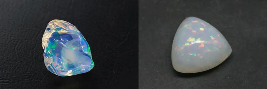 相比于水欧泊变彩的漂浮感,水晶欧泊的变彩是从内部透射出来的,而且呈色块状。