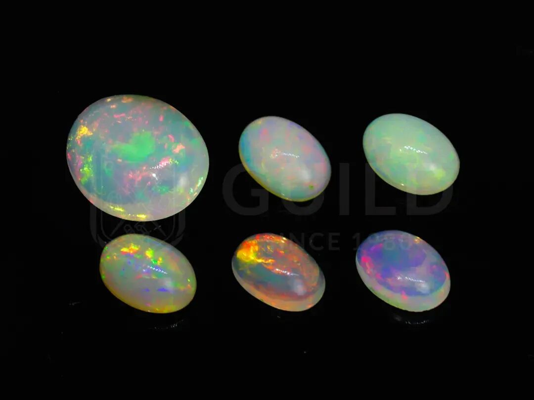 因为欧泊里小球的直径、球体间隙的距离及观察角度都有所不同,而这些因素直接决定了欧泊中色斑的颜色。比如:当球体直径大约为 0.1微米(万分之一米)时,会看到紫色;球体直径约0.2微米时,会看见红色;球体直径在二者之间,会看到彩虹的其它色彩。