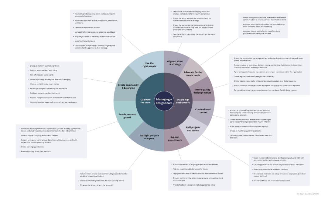 你也需要对你整个团队的工作质量负责,因为你可能不再直接负责(或可能尽少负责)执行具体的工作,这意味着你需要创建鼓励和支持以用户为中心的设计实践体系。在理想情况下,这些体系应该是自行运转的,所以一旦它们各就其位,你将无需继续花时间维持它们。我认为确保这些需求考虑的有: