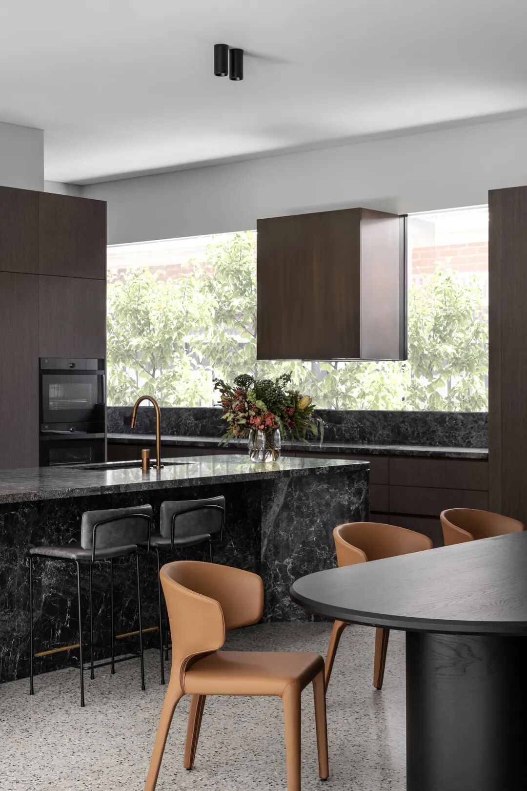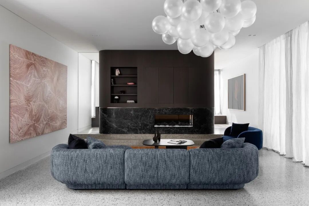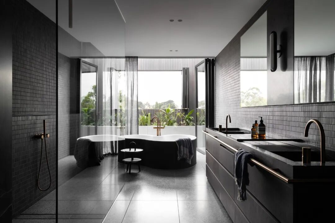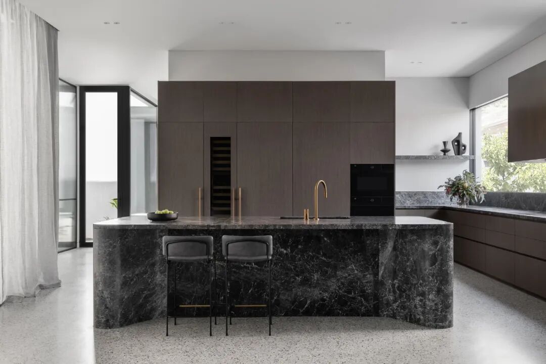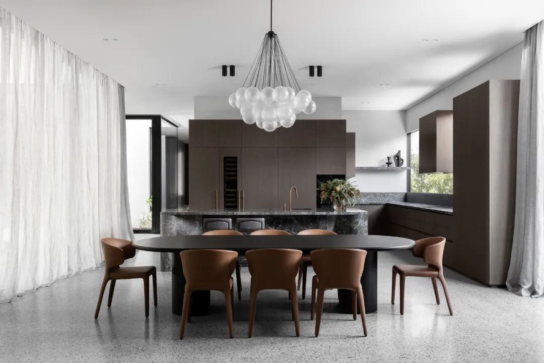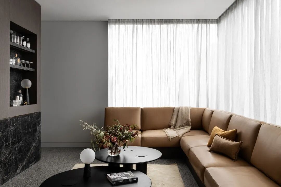 宽敞的卧室面向安静的阴能量,而生活空间和主套房位于活跃的阳能量。调色板也平衡和协调阴阳,深沉的忧郁色调的材料暗示着月光的气氛,柔和的古铜色和烧焦的橙色让人想起日食。
