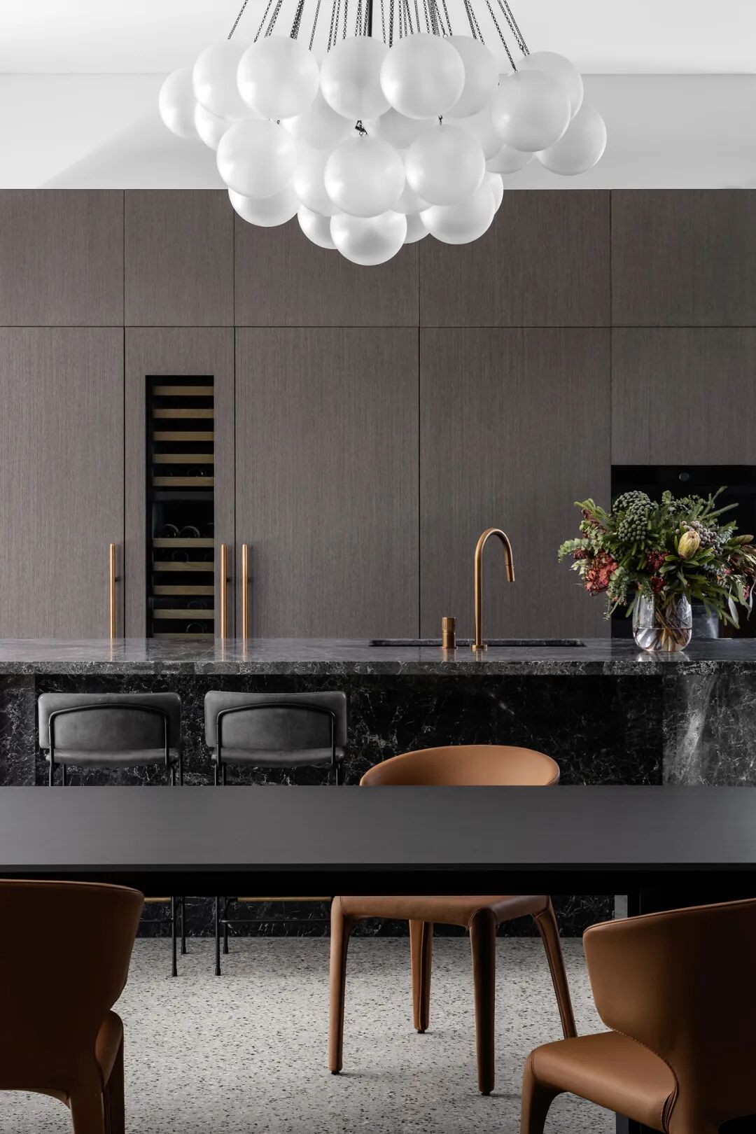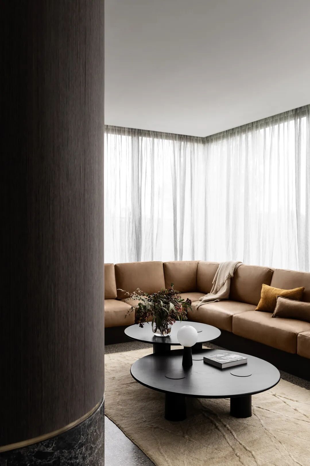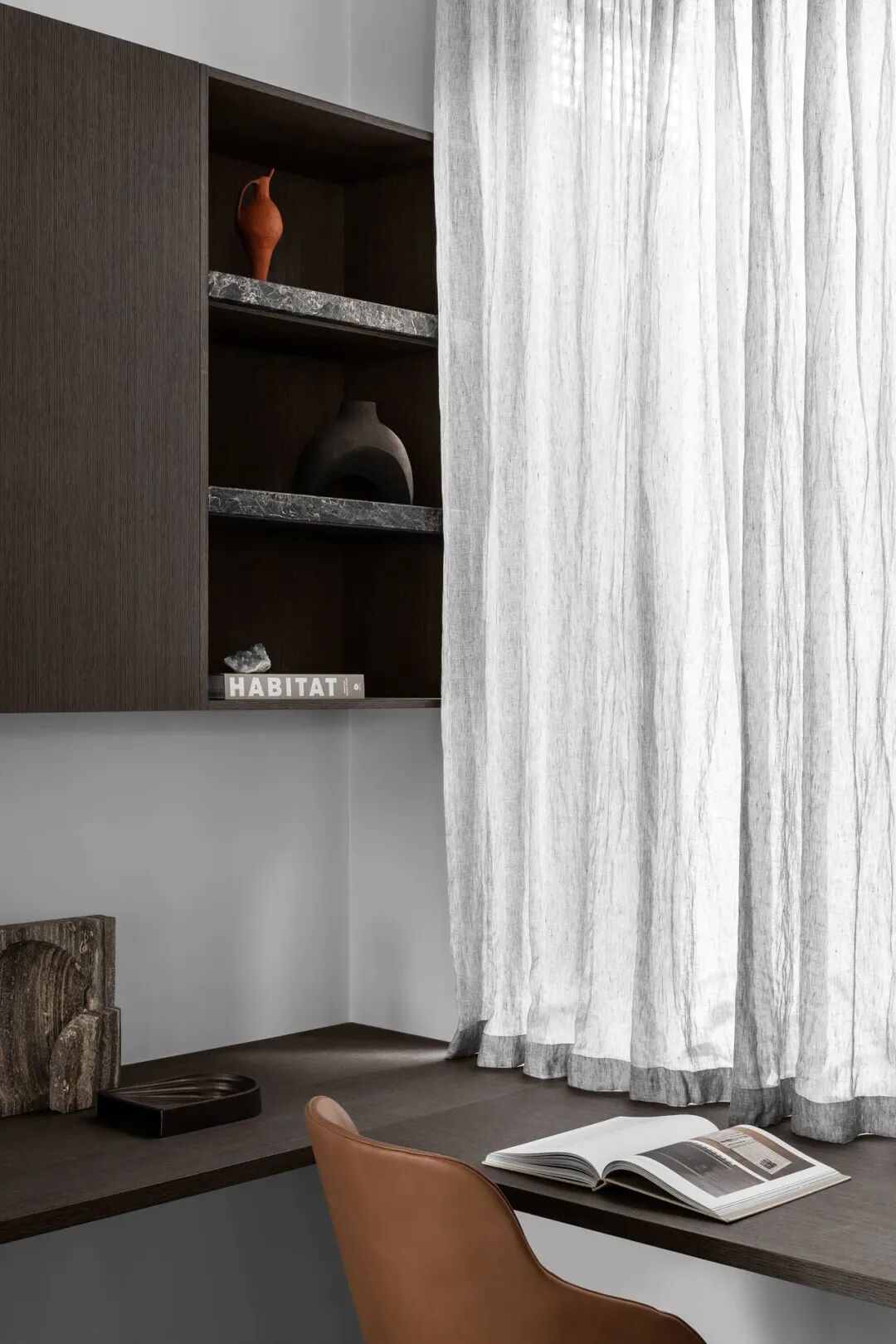 宽敞的卧室面向安静的阴能量,而生活空间和主套房位于活跃的阳能量。调色板也平衡和协调阴阳,深沉的忧郁色调的材料暗示着月光的气氛,柔和的古铜色和烧焦的橙色让人想起日食。