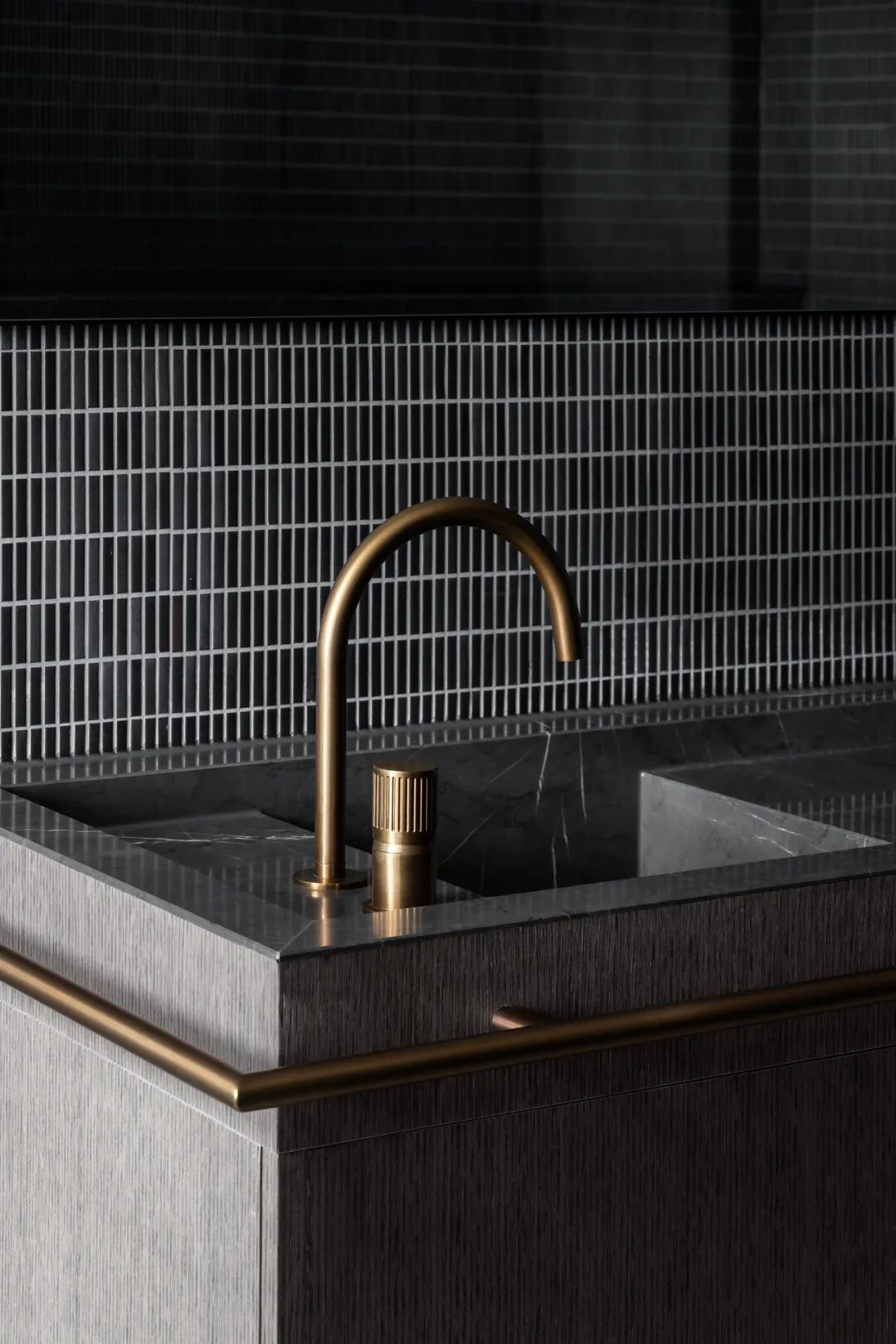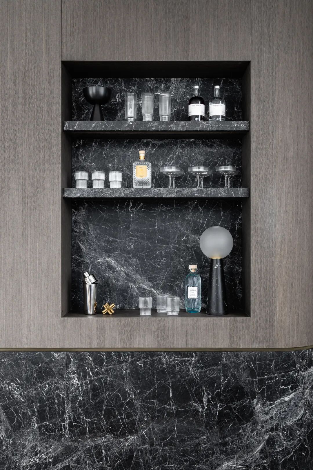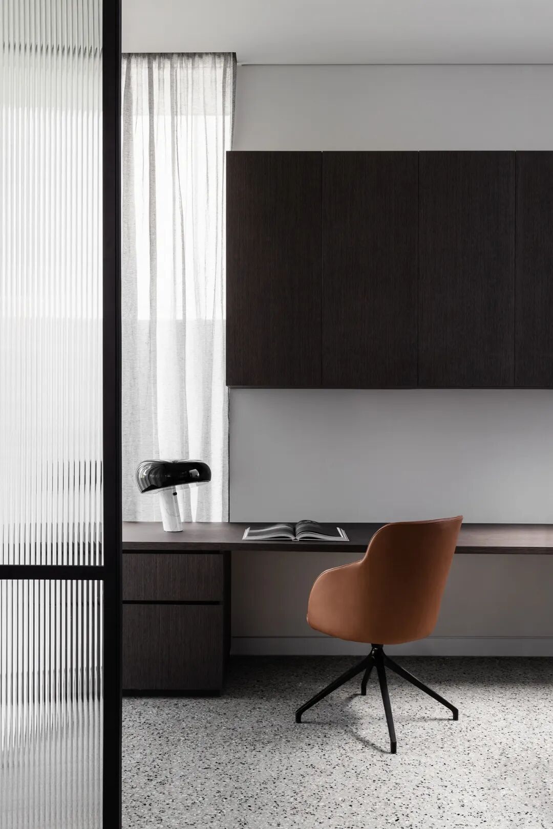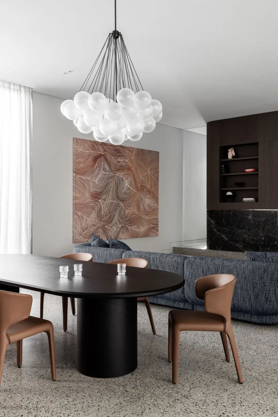 宽敞的卧室面向安静的阴能量,而生活空间和主套房位于活跃的阳能量。调色板也平衡和协调阴阳,深沉的忧郁色调的材料暗示着月光的气氛,柔和的古铜色和烧焦的橙色让人想起日食。