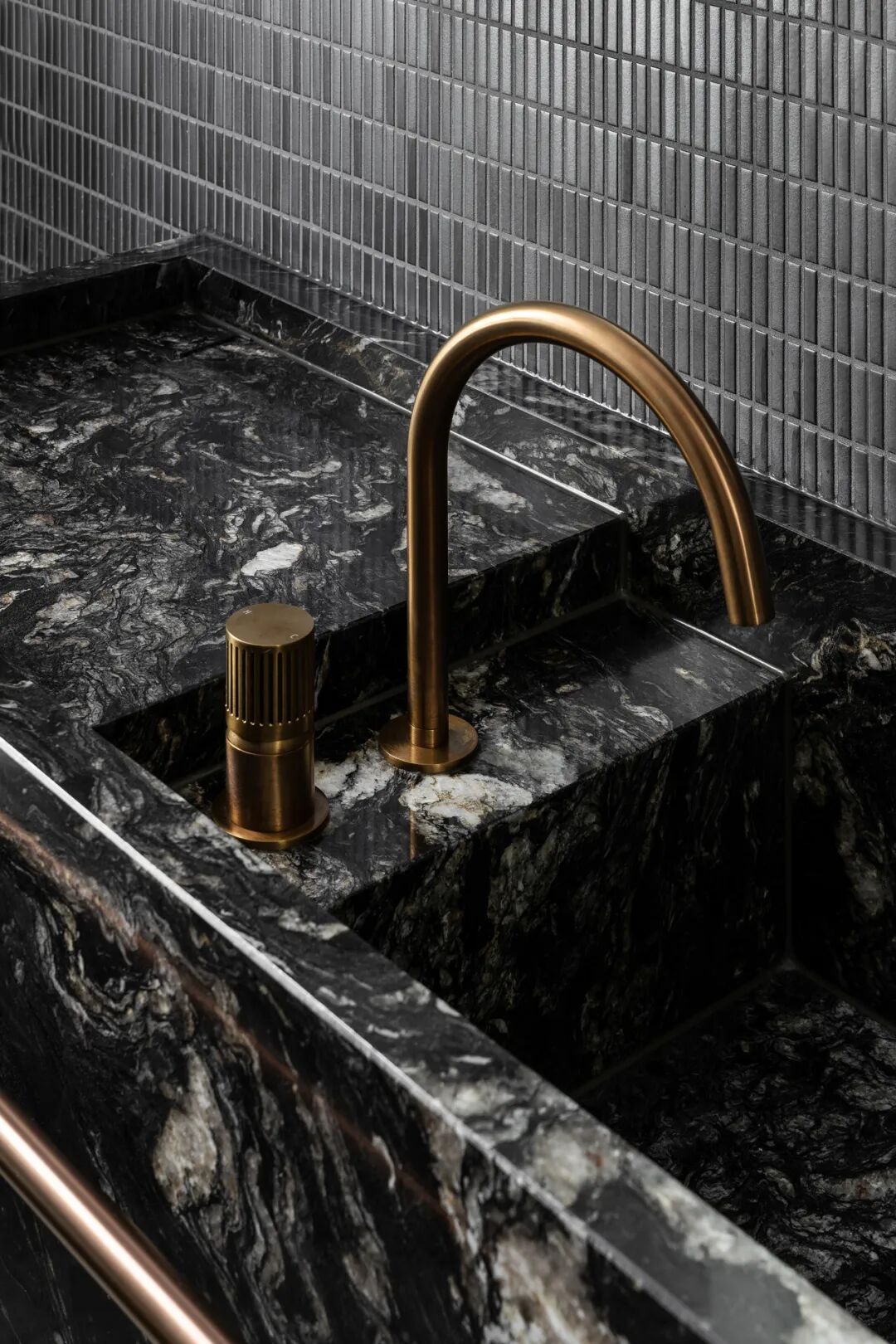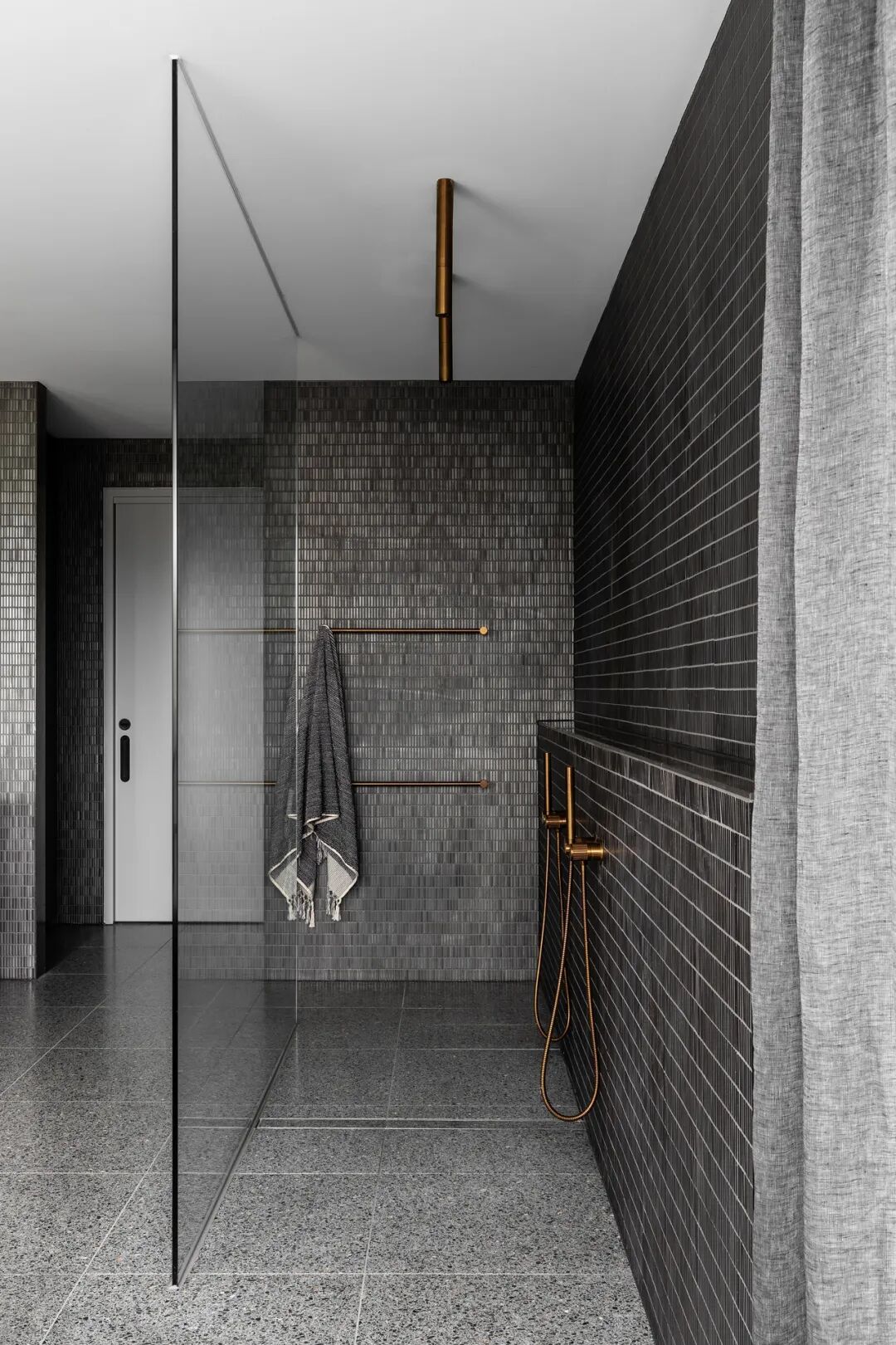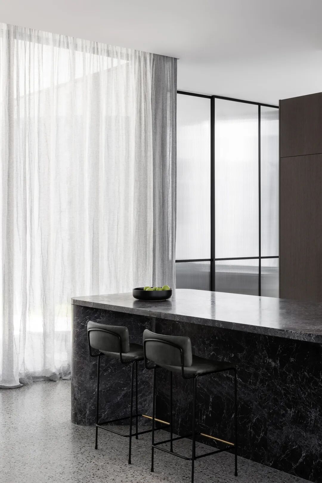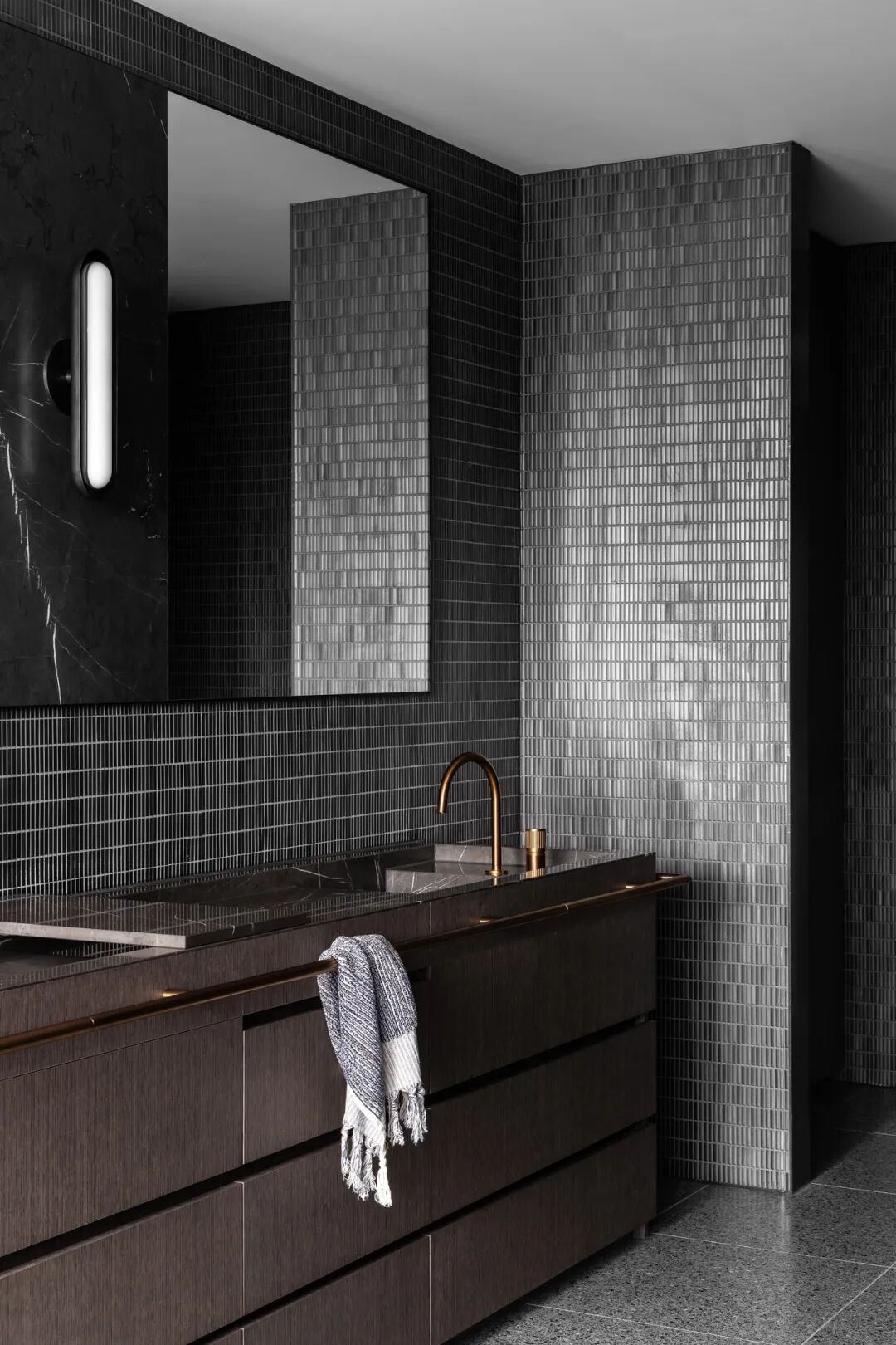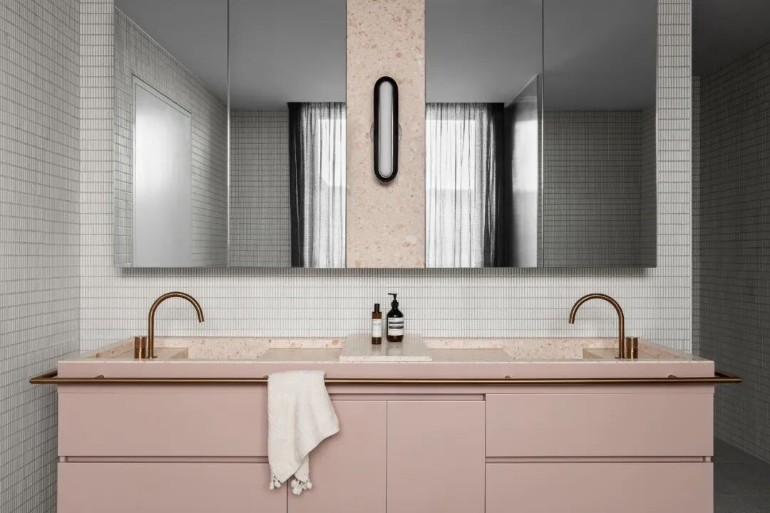浴室和盥洗室用大胆的钛花岗岩和红色水磨石提供天堂般的体验。主套间是一间私人休息室,带有一个僻静的露台,通过露台,自然光和景观使深色色调和戏剧性的炭灰色石灰岩变得生动起来。
