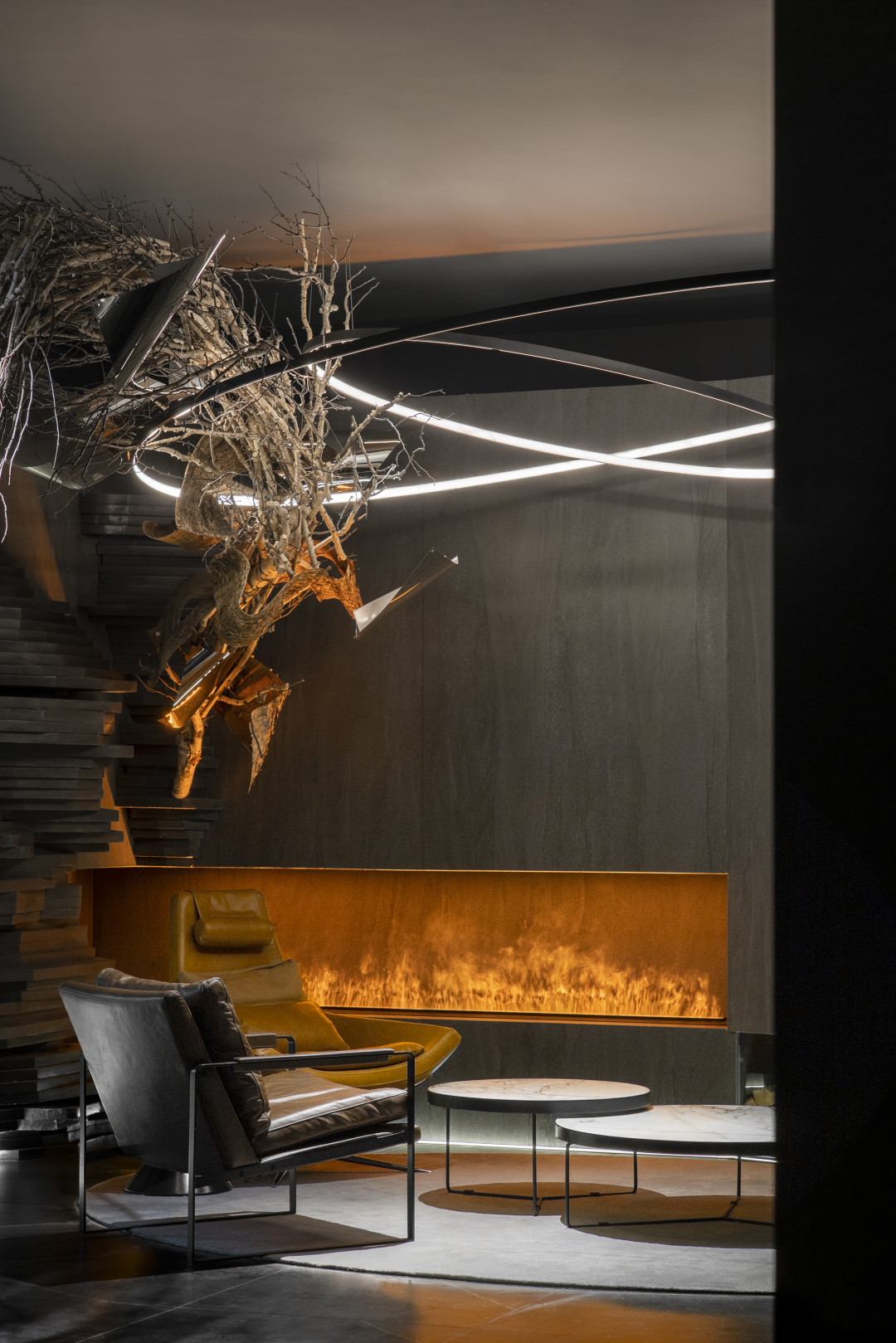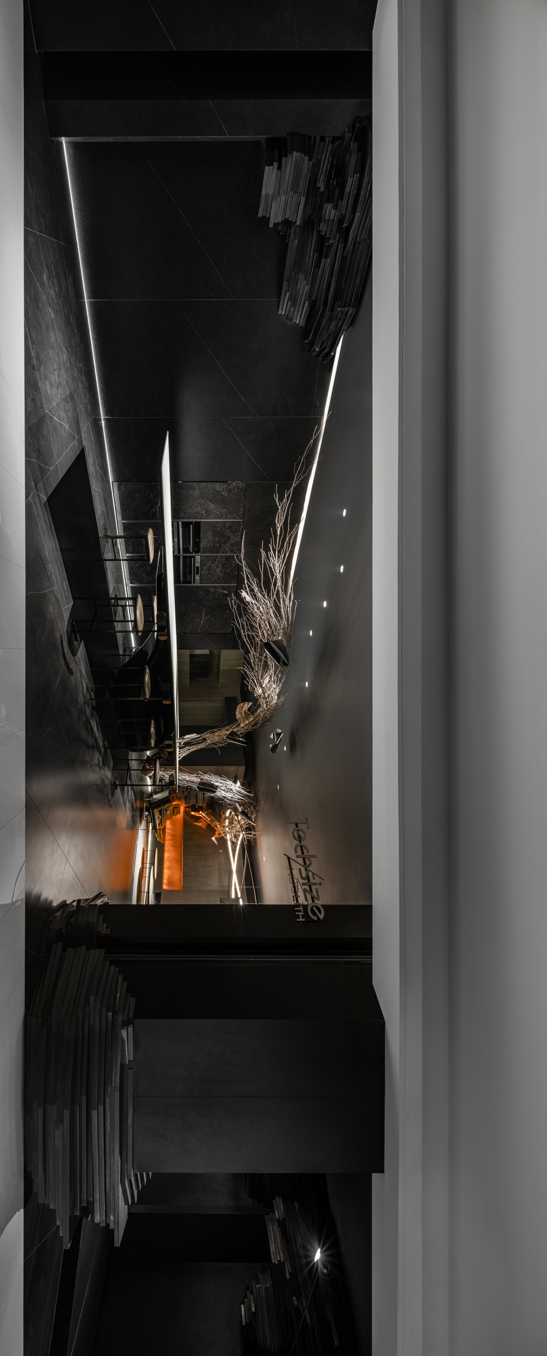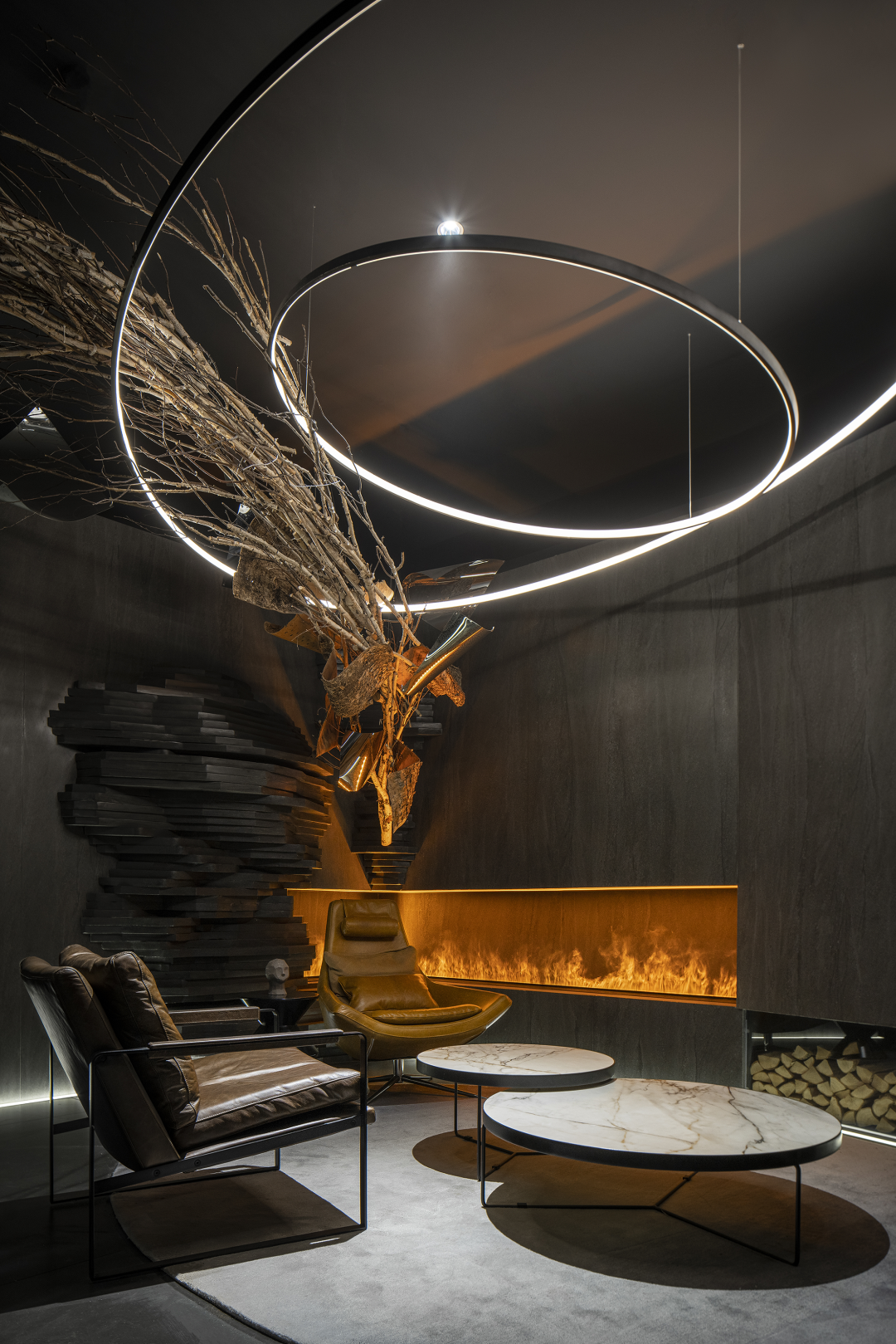 于是,在深灰的空间中,我们看到温暖的火光在闪动,充满诱惑、充满生的气息,硕长的条案是人们落座的场所,为了连接火的温暖和洞穴的坚硬与安全,设计师专门请知名的装置艺术家用草窠和竹片形成柔软的装置形成过渡,空间至此有了节奏的变化,也吟唱出生命由柔软到坚硬的变迁史。