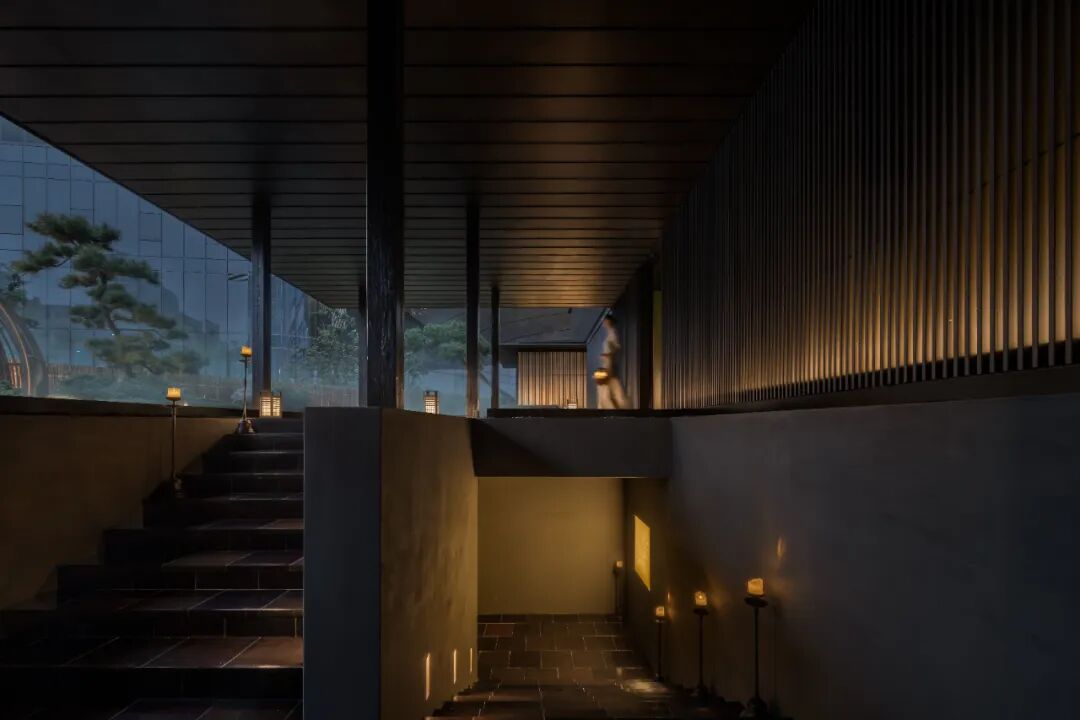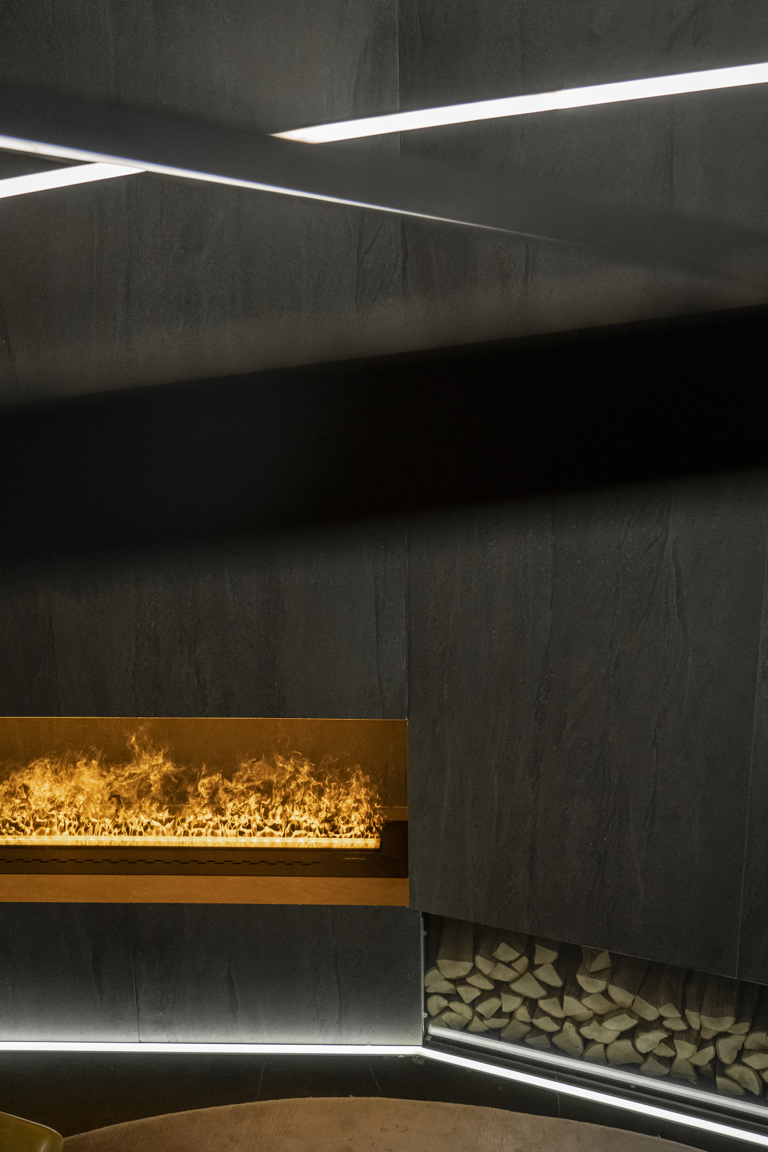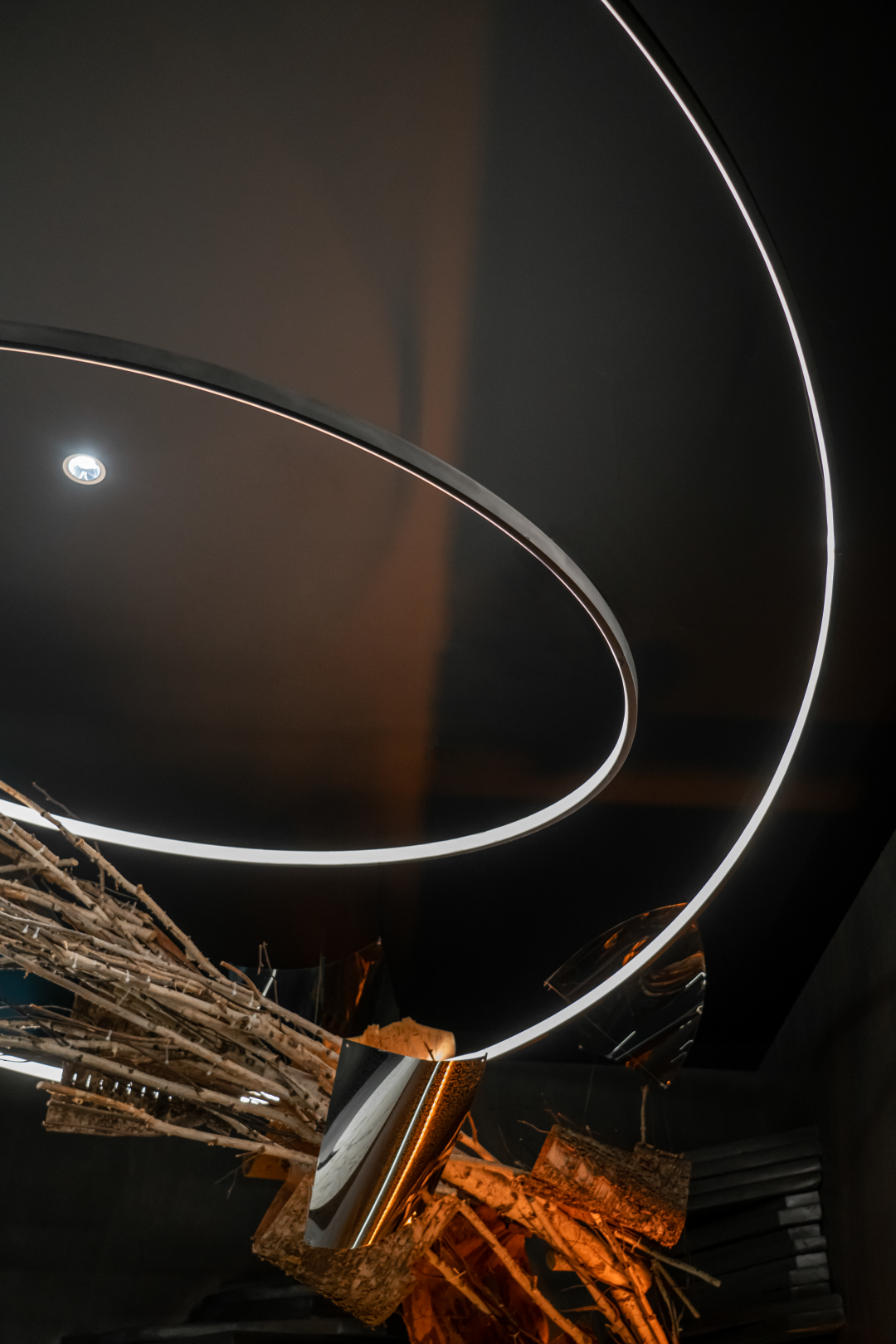 于是,在深灰的空间中,我们看到温暖的火光在闪动,充满诱惑、充满生的气息,硕长的条案是人们落座的场所,为了连接火的温暖和洞穴的坚硬与安全,设计师专门请知名的装置艺术家用草窠和竹片形成柔软的装置形成过渡,空间至此有了节奏的变化,也吟唱出生命由柔软到坚硬的变迁史。