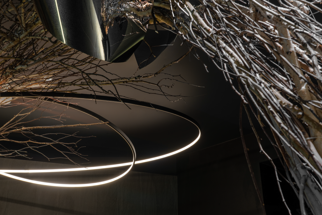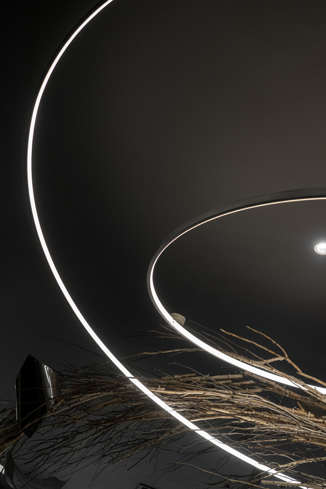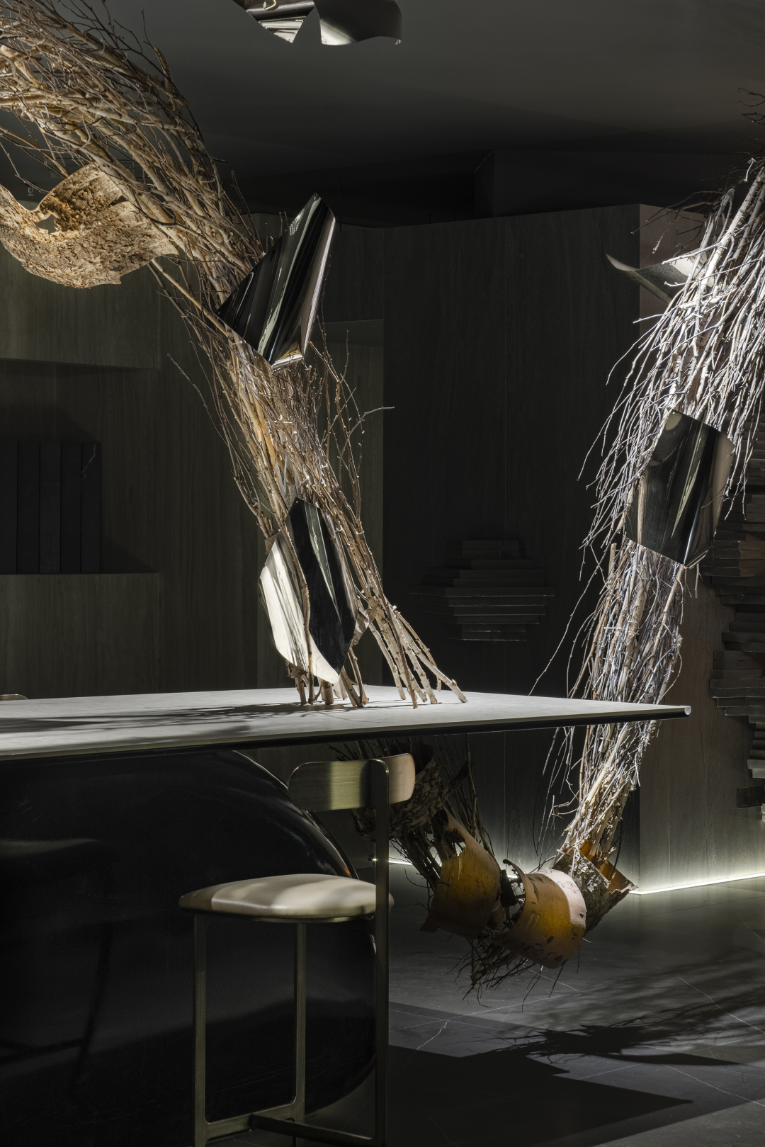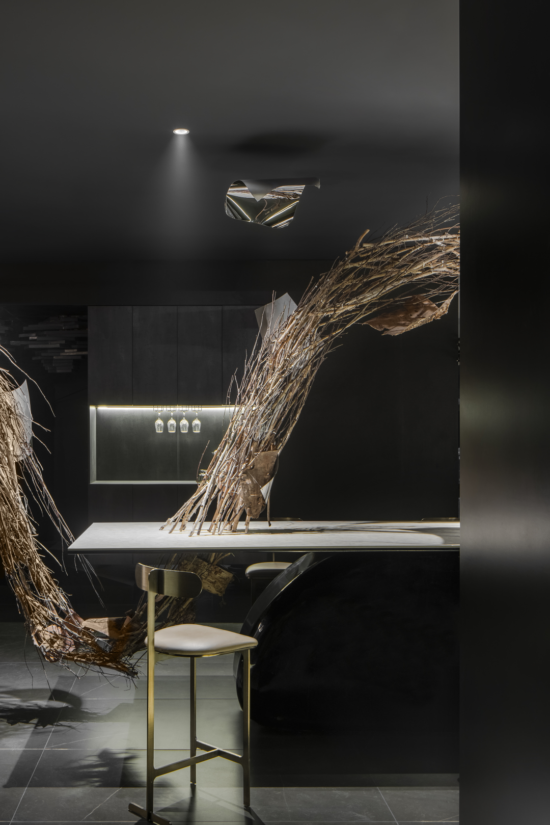 借用装置的散漫,设计师用极具抽象意味的“至上主义”方式,于是,在空间中不锈钢形成直线和圆,与草窠和竹片相互缠绕、形成“骨与肉”的关系蔓延着、生长着……设计师在这里用了“涩”的方式,使空间变得生动、性感、不再油滑:设计师利用空间的深度,将整体空间分为选材区和设计讨论区两部分,并最大限度地利用德赛斯岩板,在空间中划分出自然的形态,却不使空间憋屈、压抑,张弛有度,极具设计的戏剧性。