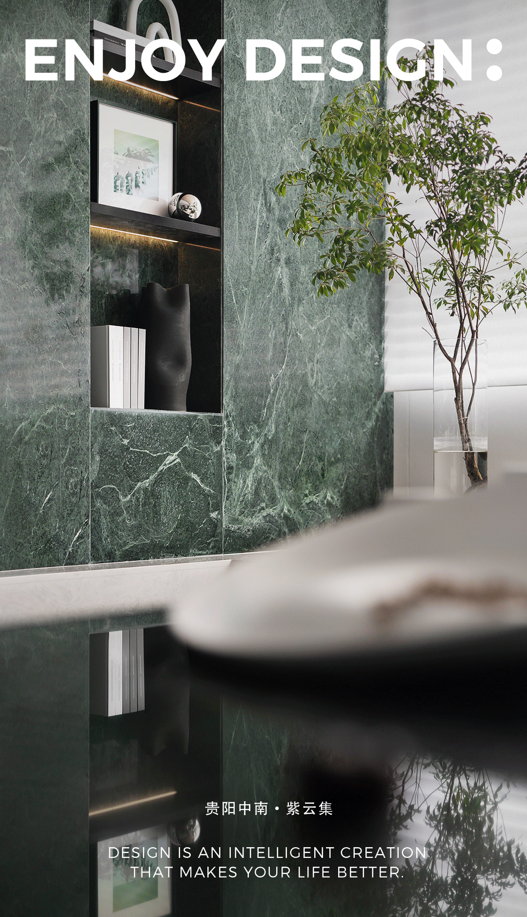 永生绿植装饰、墨绿大理石餐桌,不同材质的「绿」与米色装饰面形成自然质感的碰撞,让整个餐厅勃勃生机而不沉闷。