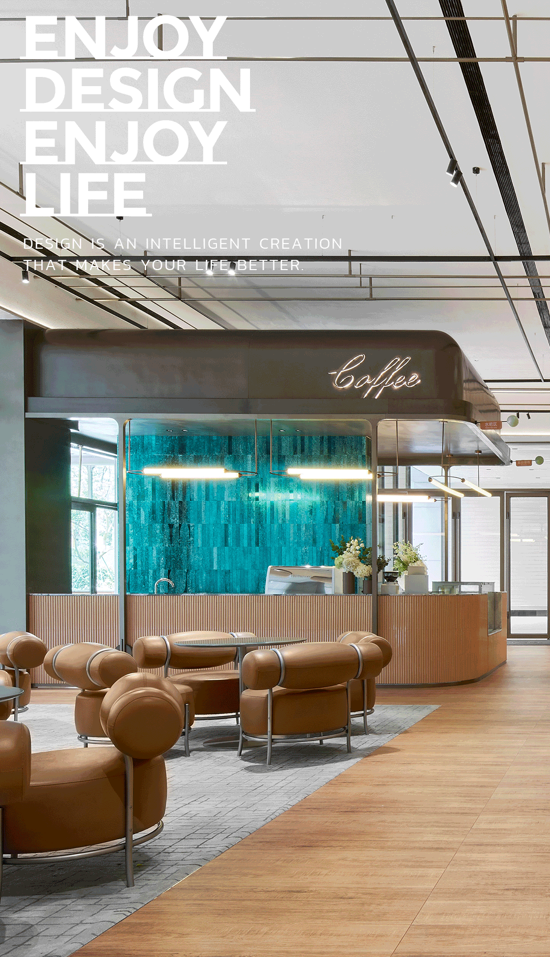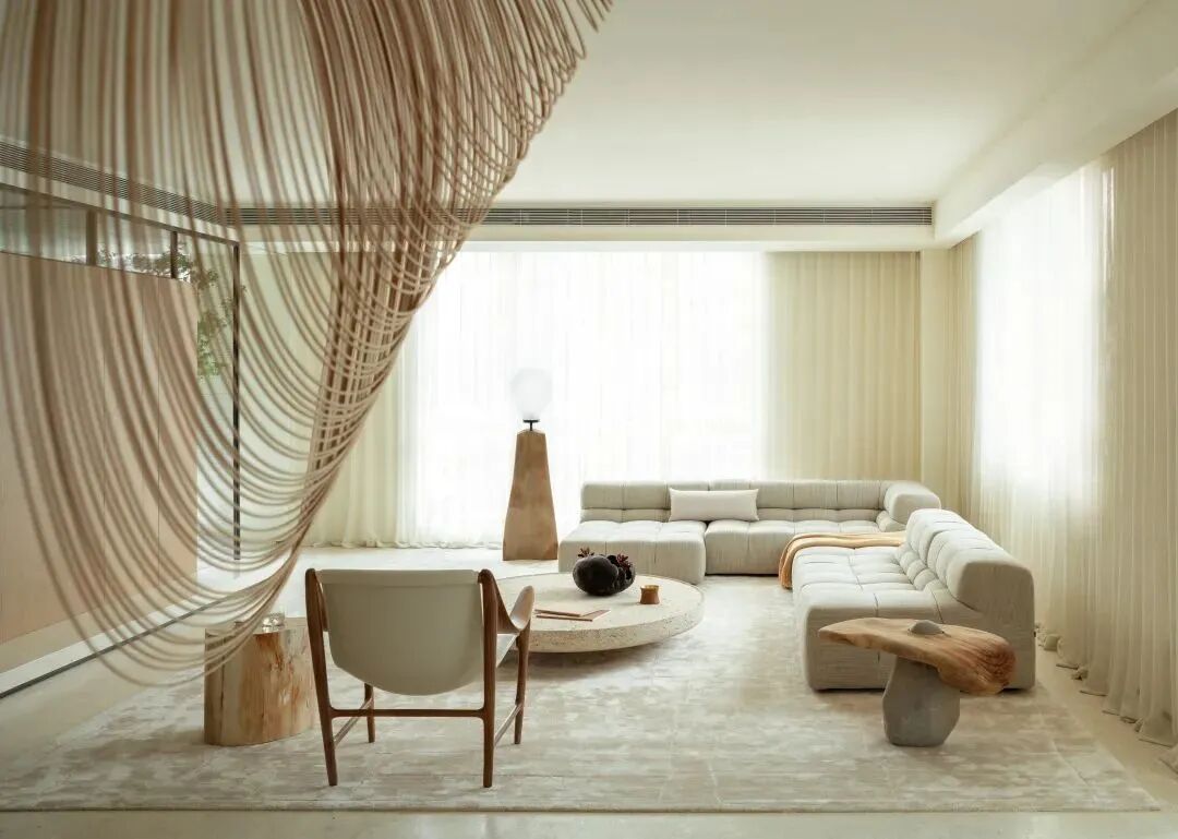 浸入室内,空间以大地色为基调,整厅的米色地毯和装饰面将温暖层层叠入,大胆点缀上颇有张力的森绿融入空间色调,即刻充斥着野性的自然之力,整个空间灵动自然。
