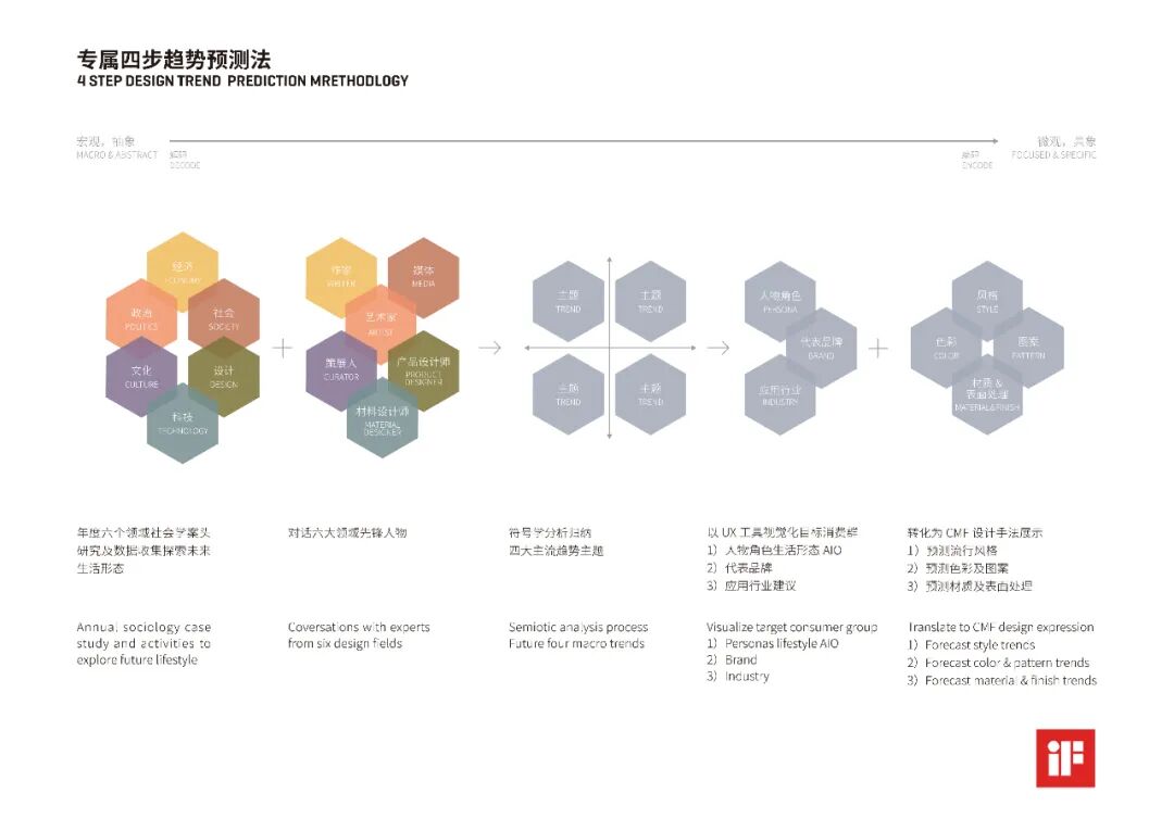 通过以上专属设计趋势四步预测法,他们把宏观、抽象、概念性的趋势背景,转化为微观、具象、可见的设计手法。从2020年起,这套趋势研究方法也被德国iF官网推荐给全球的设计师。