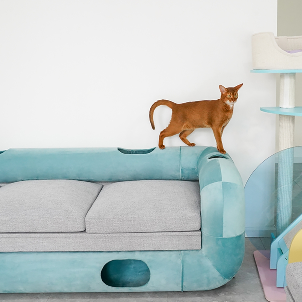 宠物生活方式品牌zeze主打人宠共用的理念,围绕人宠和谐生活,以及让他们之间的情感链接如何更加紧密。他们的沙发人和宠物可以一同共用,坐在沙发上的主人可以和在树洞猫窝中的猫一起玩耍。