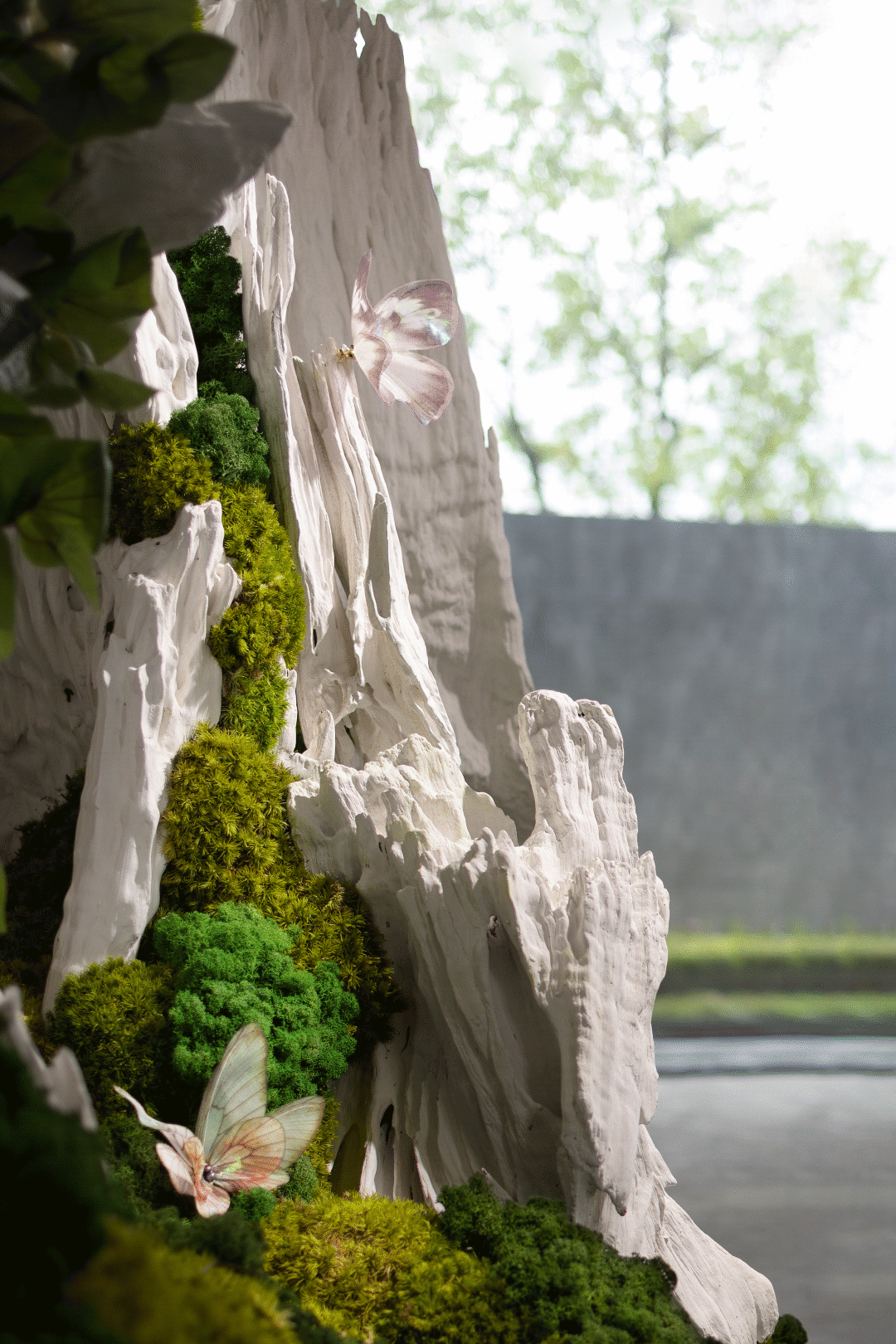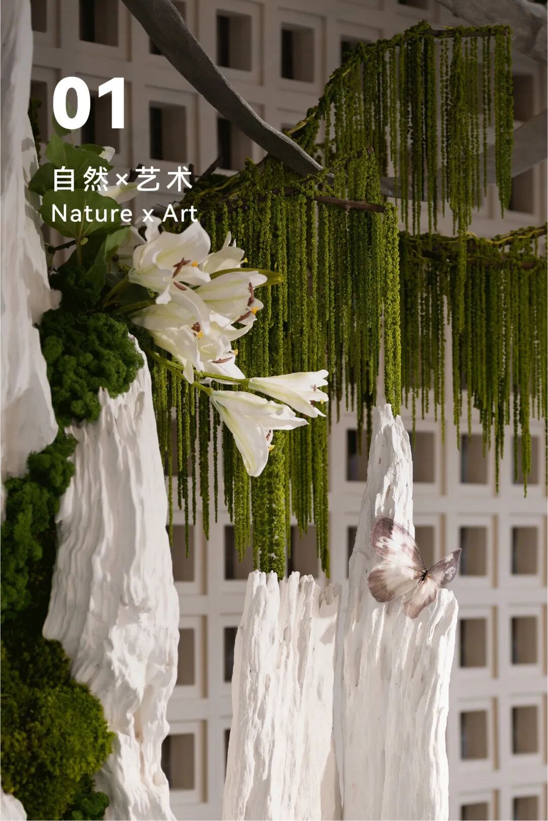 大型自然生态装置由原生态木雕,经过艺术形态的切割及组合而成,自然美感的肌理,加上永生苔藓增加色彩的层次,细节以充满科技感的金属球装点,再辅以蝴蝶点缀,错落光影间,打造更富情感语言的第一视觉焦点。