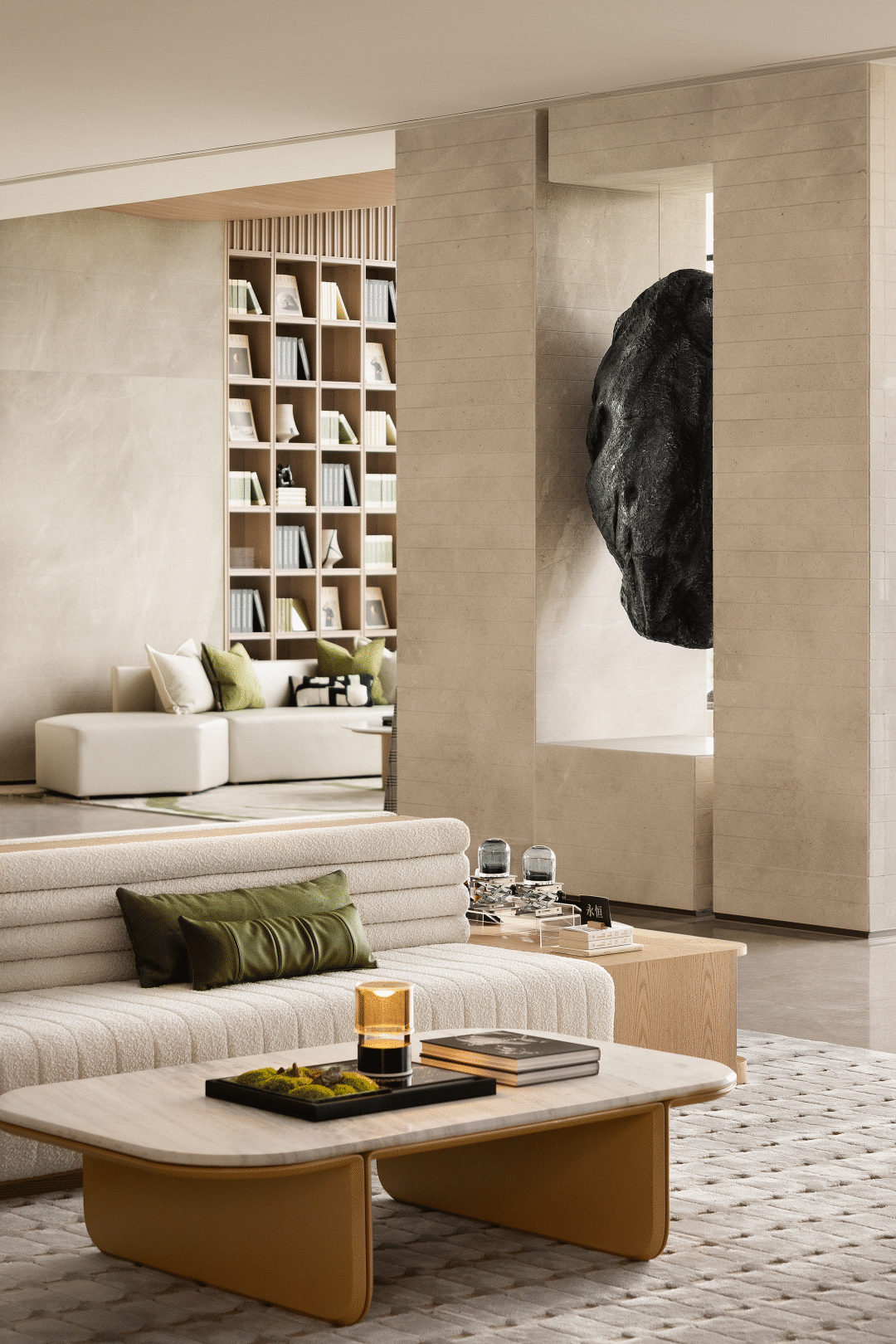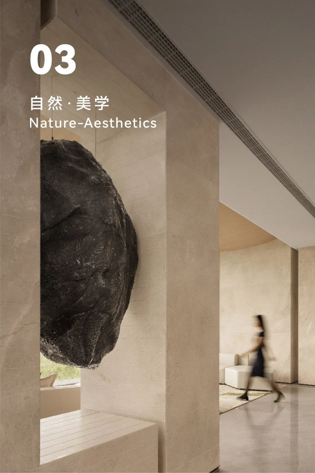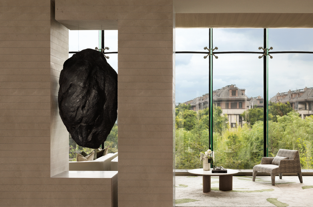 悬浮于场域中间的黑色巨石,与窗外远山与自然景观形成呼应,延展生机与律动之美,冲击访者的视线,形成一种特殊震撼的氛围感。