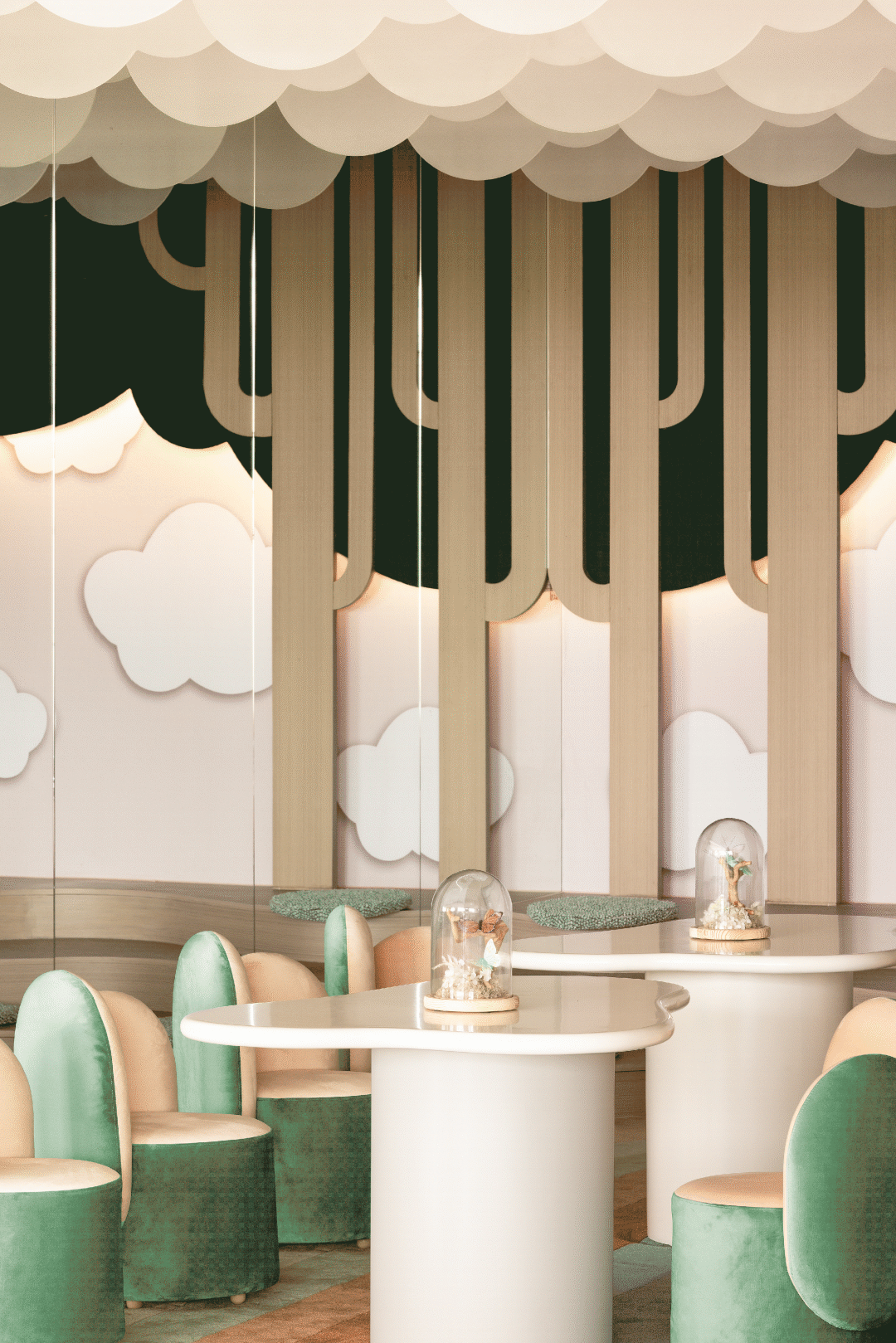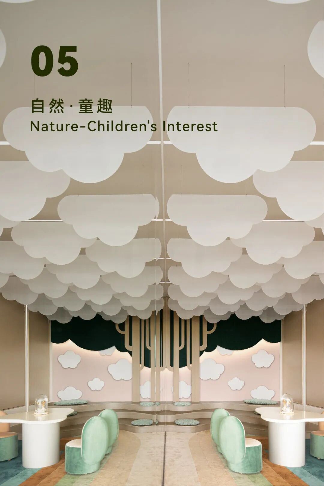 整面的镜面语言,缓解该空间的狭长感,墙面的郁郁森林在镜面的映衬下盎然而生,碧草如茵的草地上和层叠的云朵下,承载的是他们纯真甜美的童年时光。