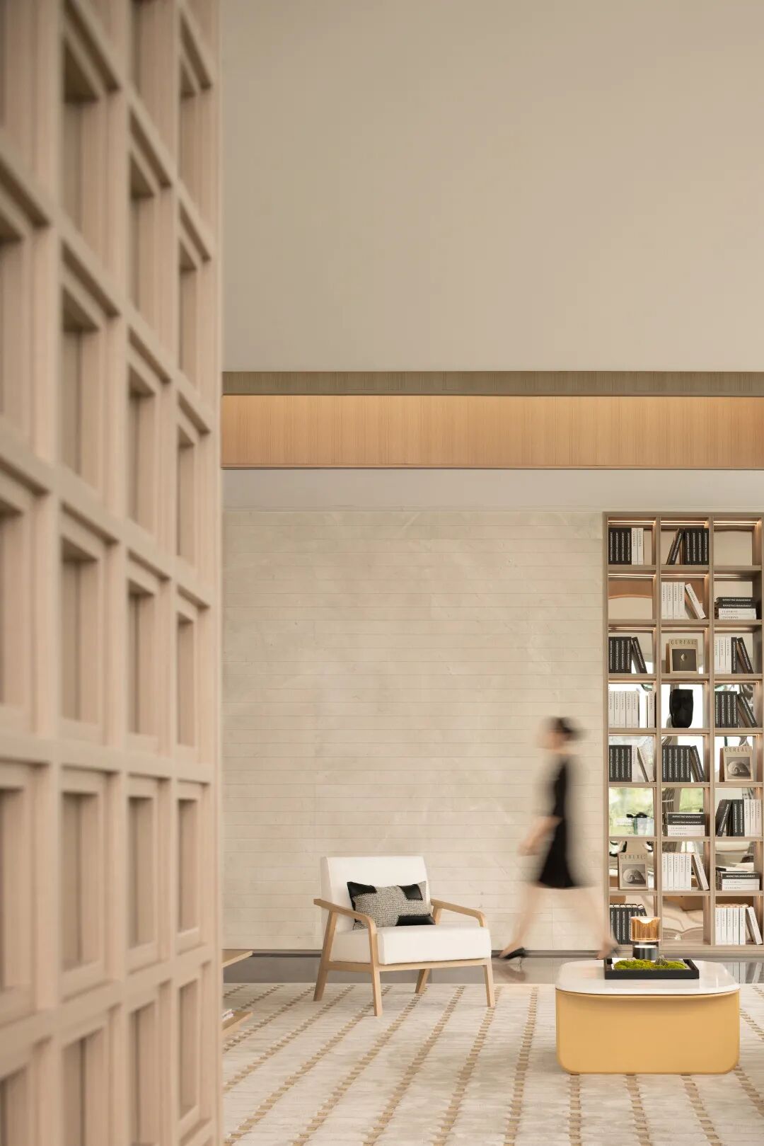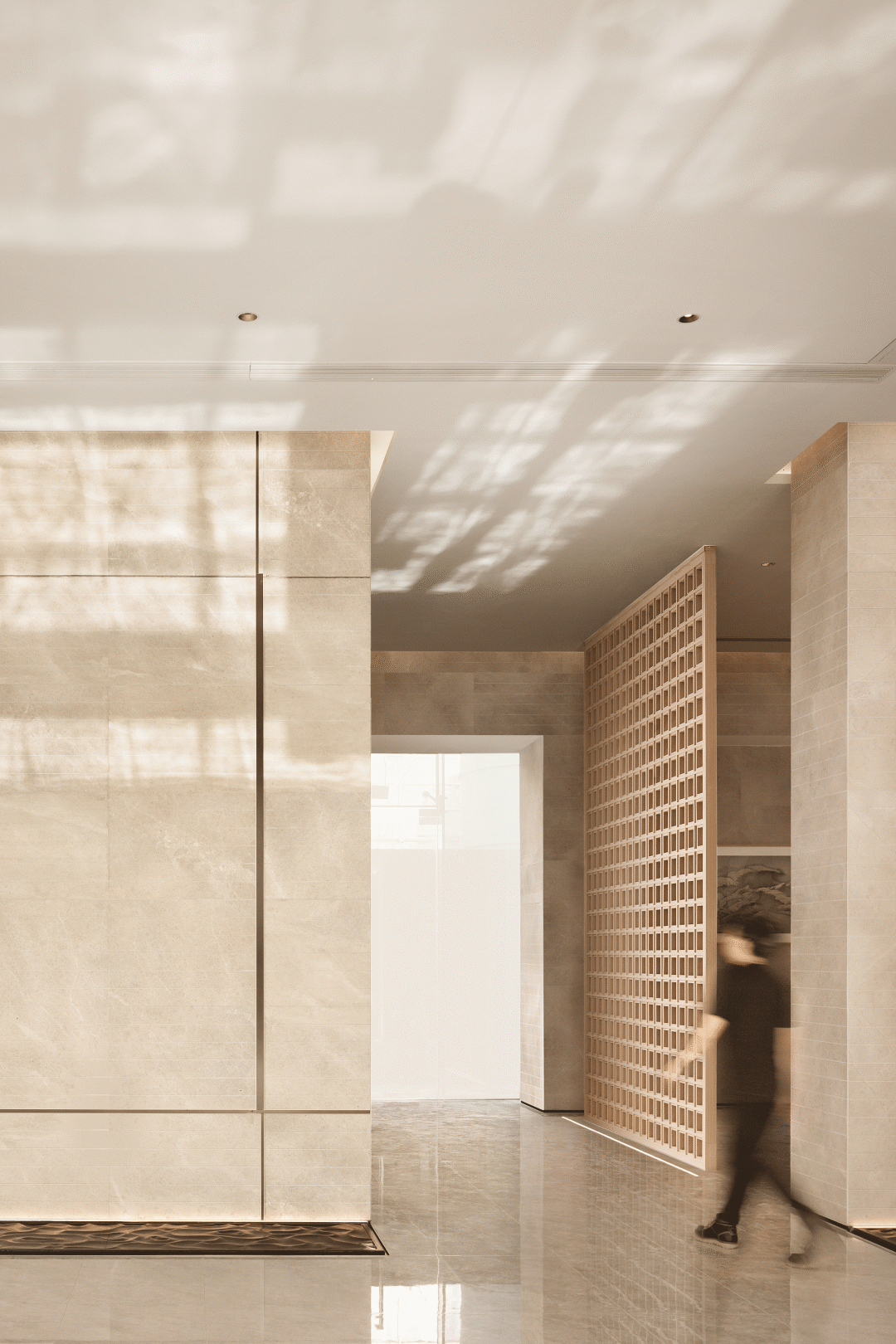 屏风镂空的设计与整体空间形成连贯性与互动性,通透光影与木色栅格相映成趣,营造畅想舒适自然的漫游逸境,予访者仿若置身仙境的美幻感。