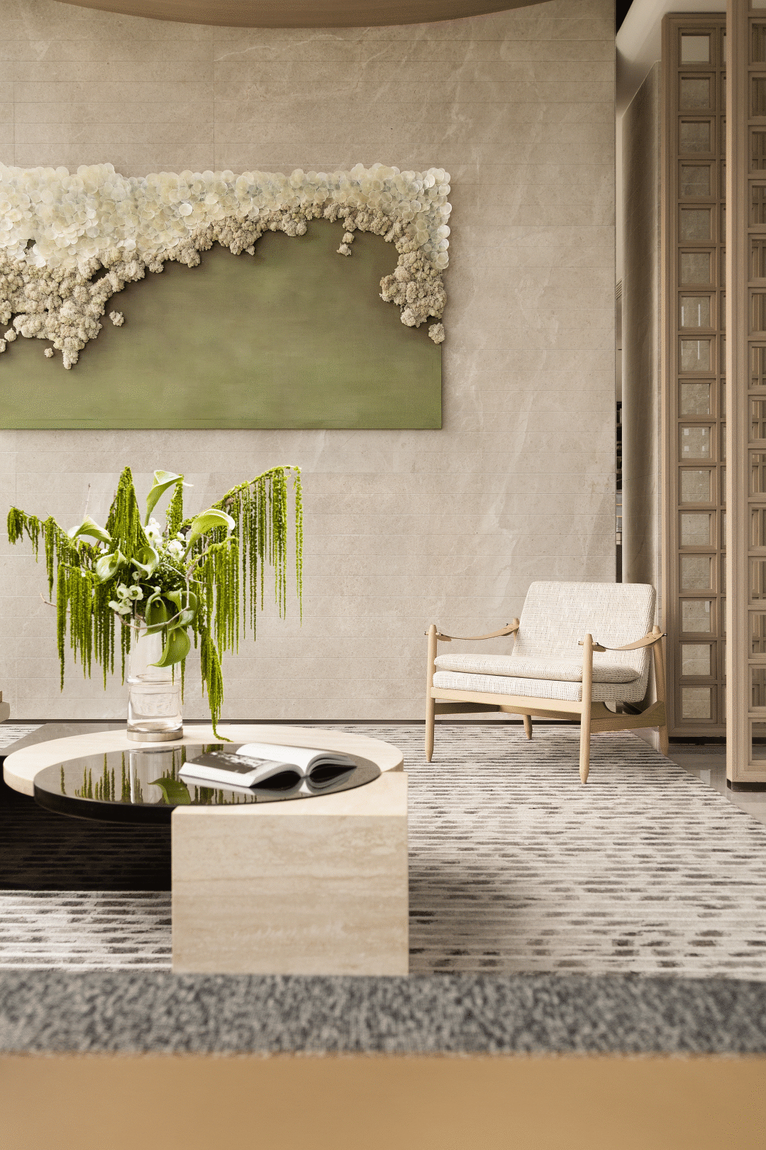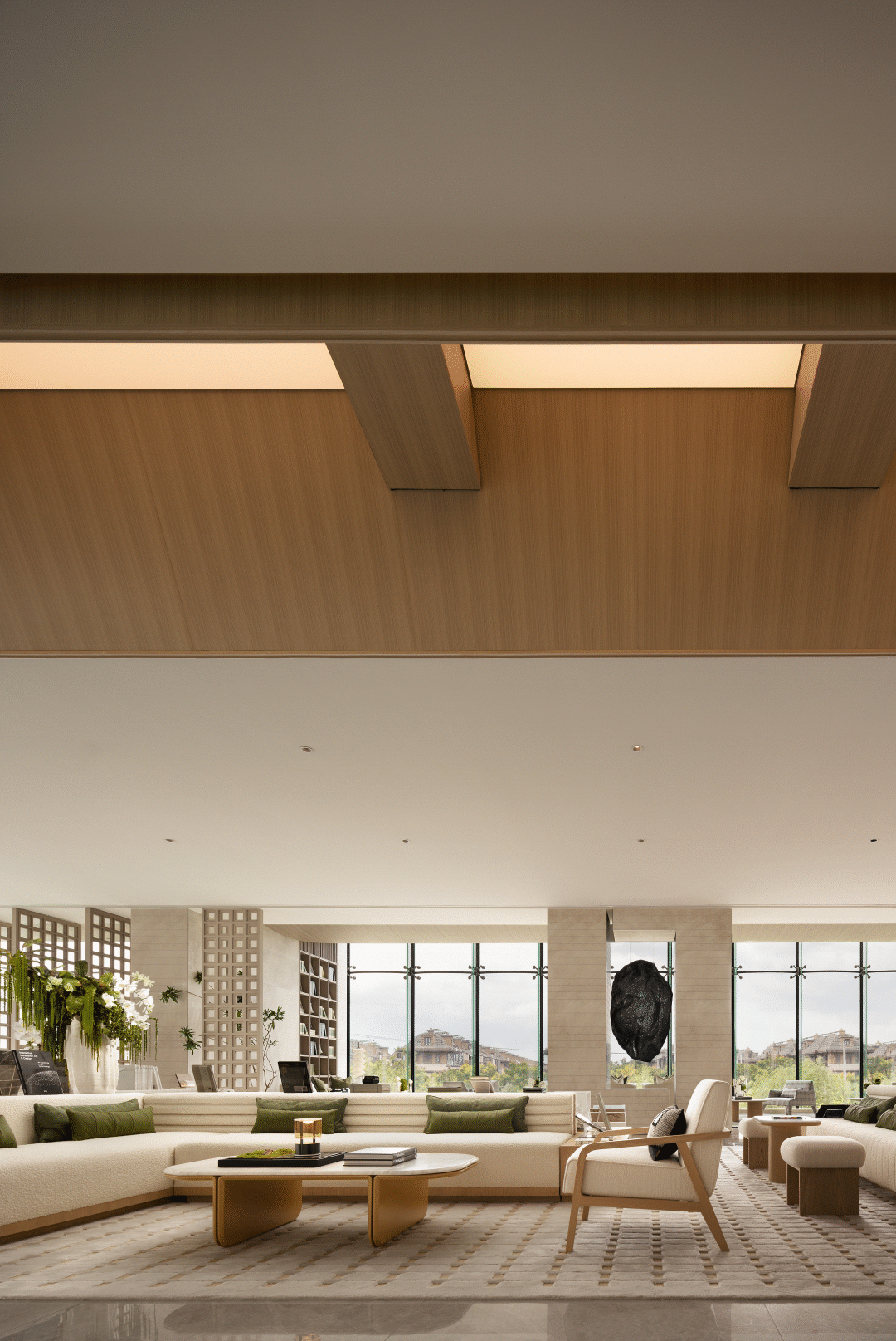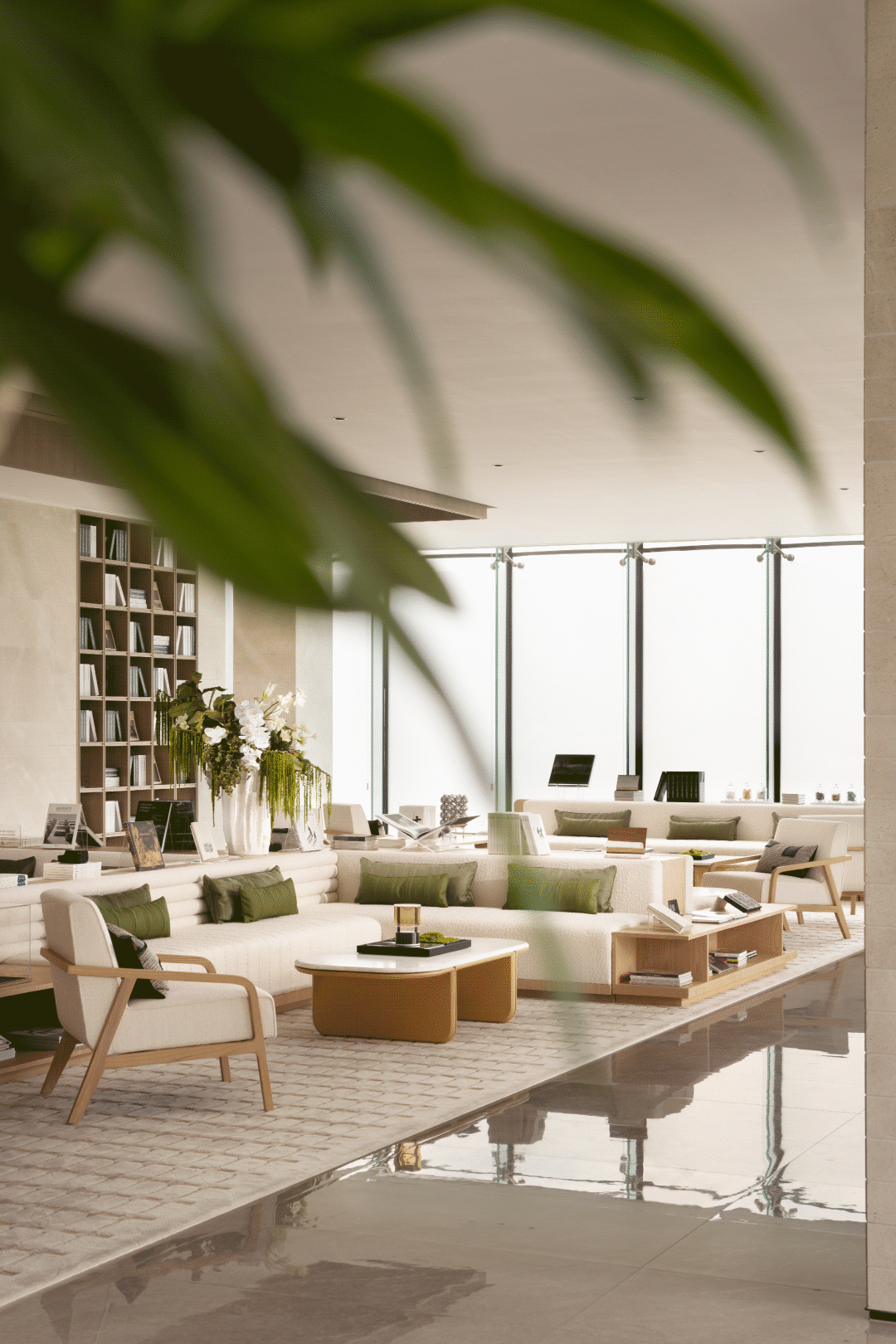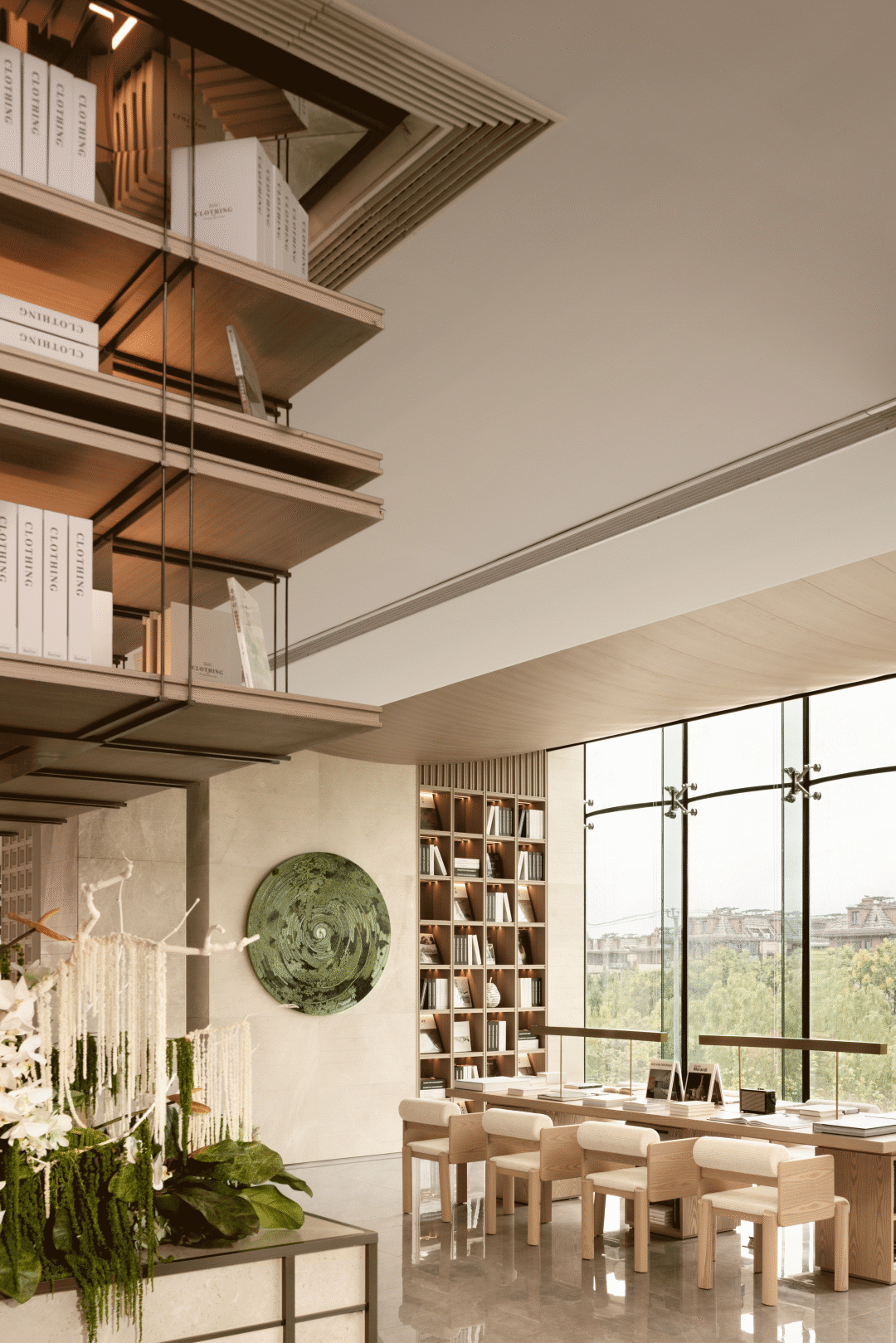 空间整体延续硬装调性,大面积铺设天然原木色木饰面,营造软硬一体轻松整体的空间氛围,并在空间中会加入大量的米白与绿色调的花艺装置来表现自然生态的氛围。