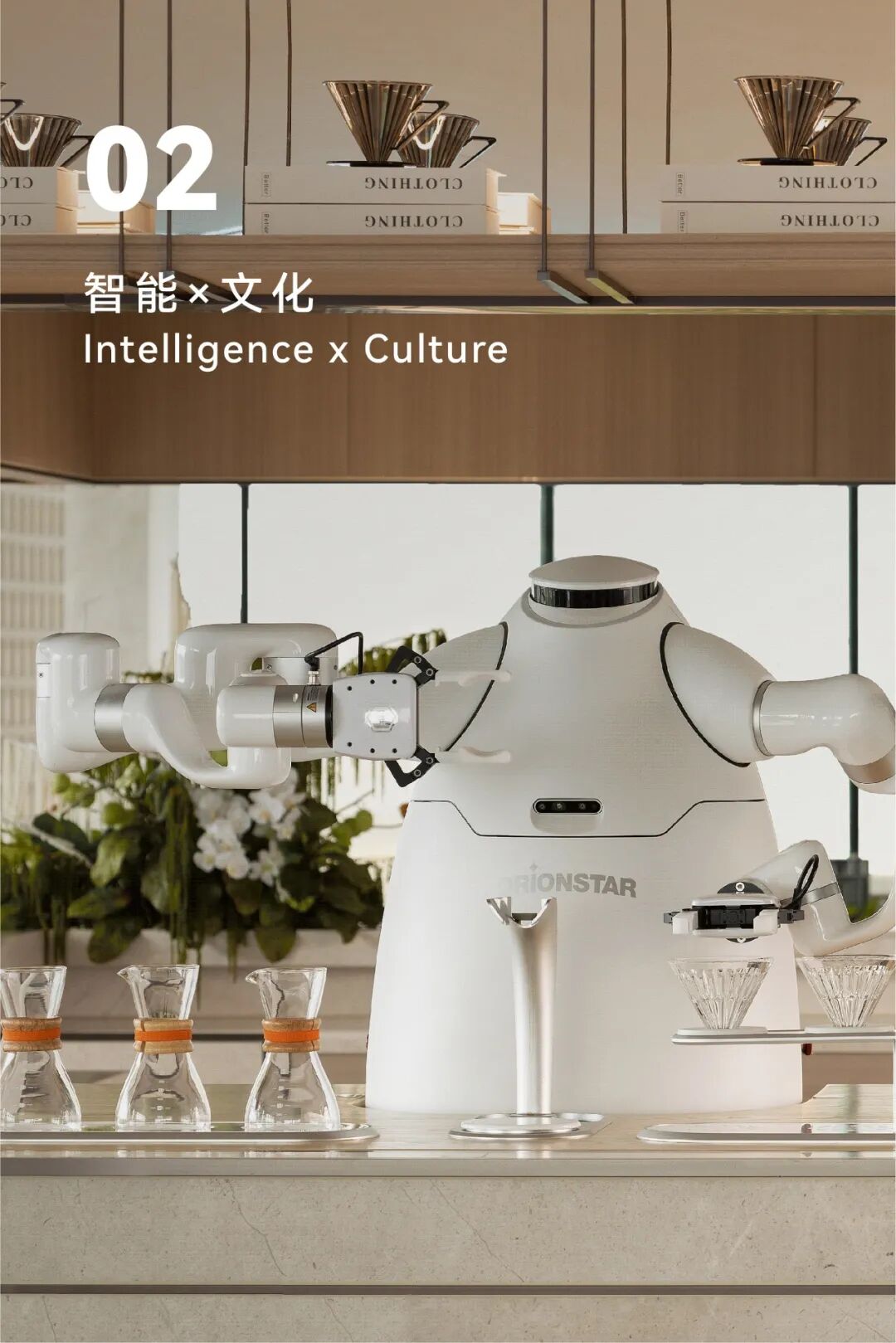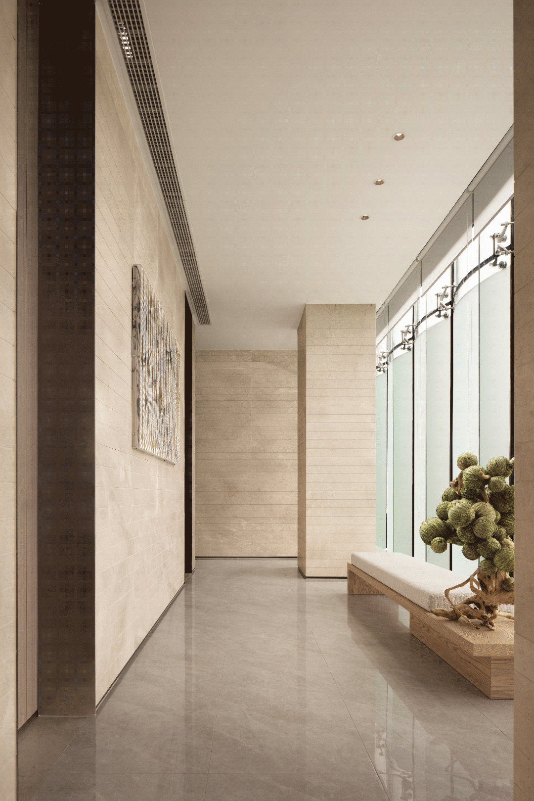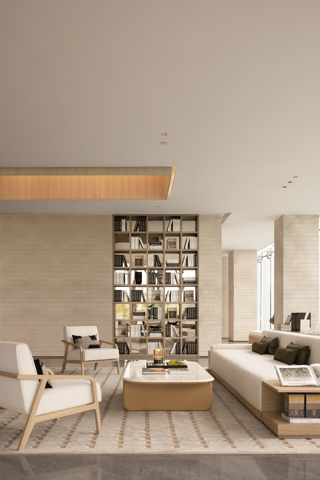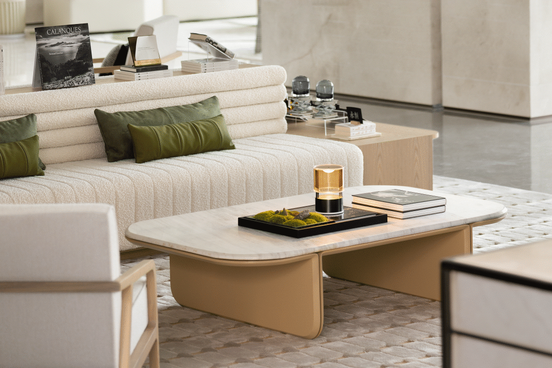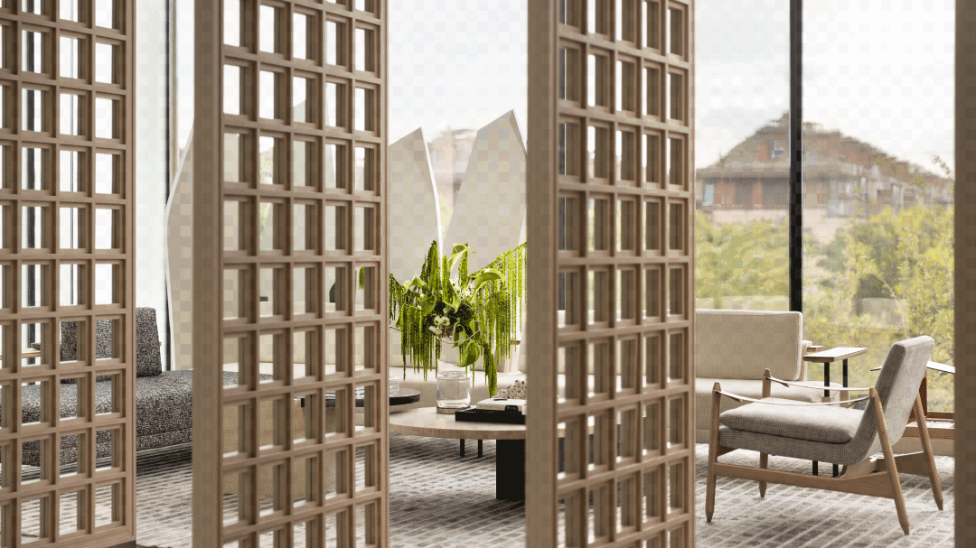 空间整体延续硬装调性,大面积铺设天然原木色木饰面,营造软硬一体轻松整体的空间氛围,并在空间中会加入大量的米白与绿色调的花艺装置来表现自然生态的氛围。