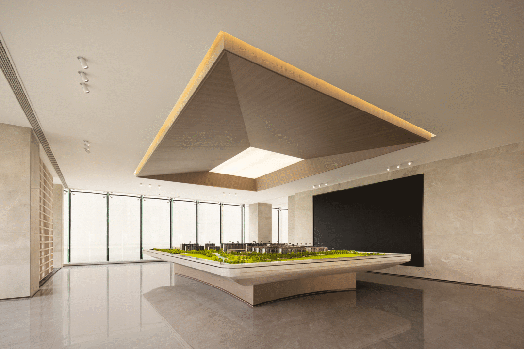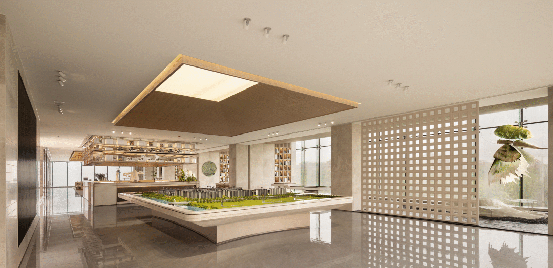 在光的引导下,自然与城市产生交集,水泥砖和地面静态水纹延续和自然的对话,引领观众的感官体验。漂浮感的沙盘设计和建筑语言呼应,在弱化沙盘厚重感的同时展现空间的通透,温润的木色和米色基底搭配,为恬静的聚合场营造奠定了殷实的基础。