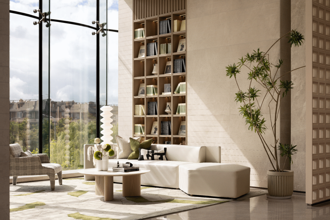 巨大的一体式落地玻璃幕墙将自然优雅的引入室内,在提供绝美的景观视野同时,打破室内外的边界,人与自然交融的共生形态,拥有细腻肌理的石材与通透光影,在硬朗有力的线条元素的勾勒下,造就简洁明快的现代语境。