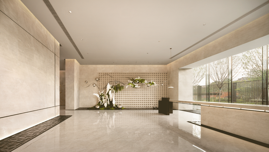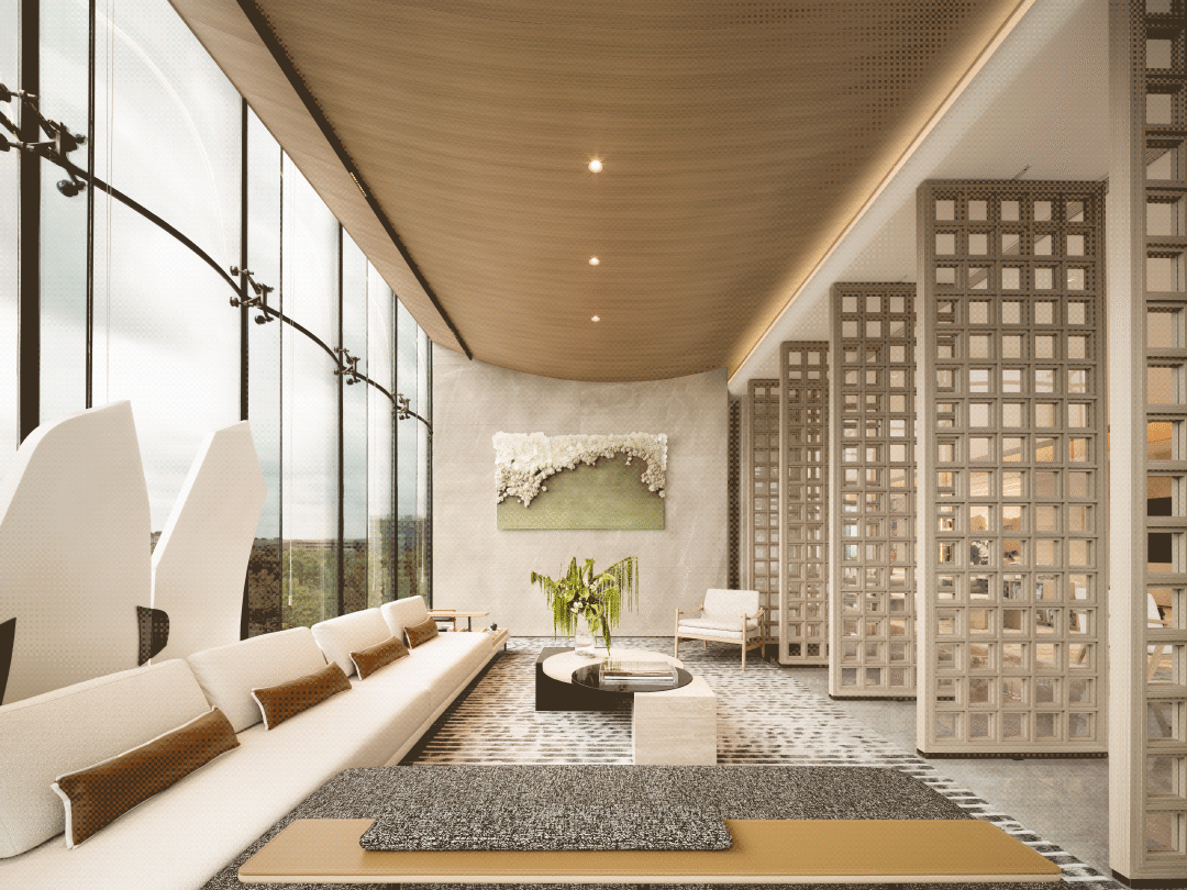 室内设计以建筑本身的悬浮设计造型,结合大面积玻璃幕墙的室内外的无界视觉,这两大要素为引,延伸出“漂浮&聚场”的设计主题。融入WELL社区价值标准,以生态学和可持续为主题,以开放性的社区形态,打造一个多维社交聚合的自然美学生活馆,融合山石鱼虫的艺术凝聚,创造一个舒适恬静的综合感官体验。