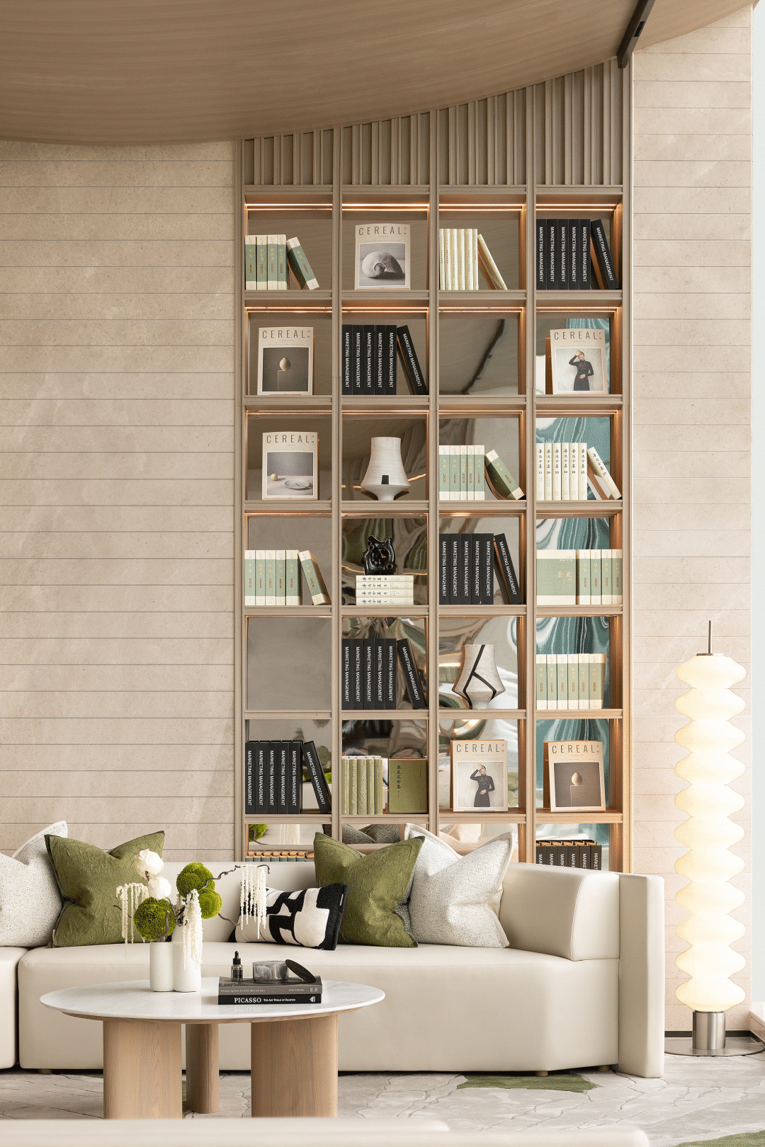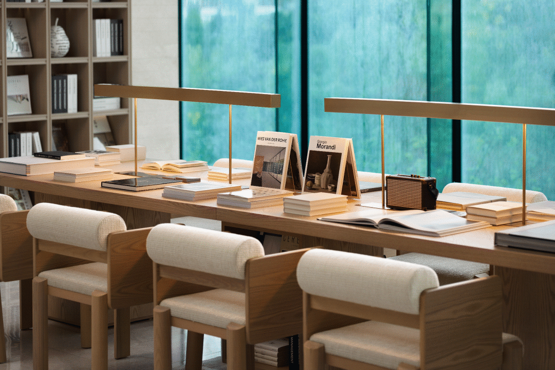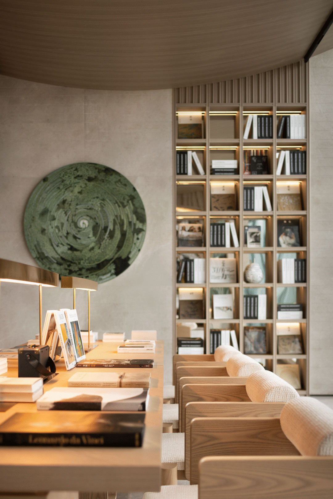 文创空间充满艺术人文调性,家具通过再设计与硬装造型相呼应,倚靠的靠垫取自湖泊圆的再设计,融入天方地圆的东方理念,来唤醒人们内心深处被忽略的声音。