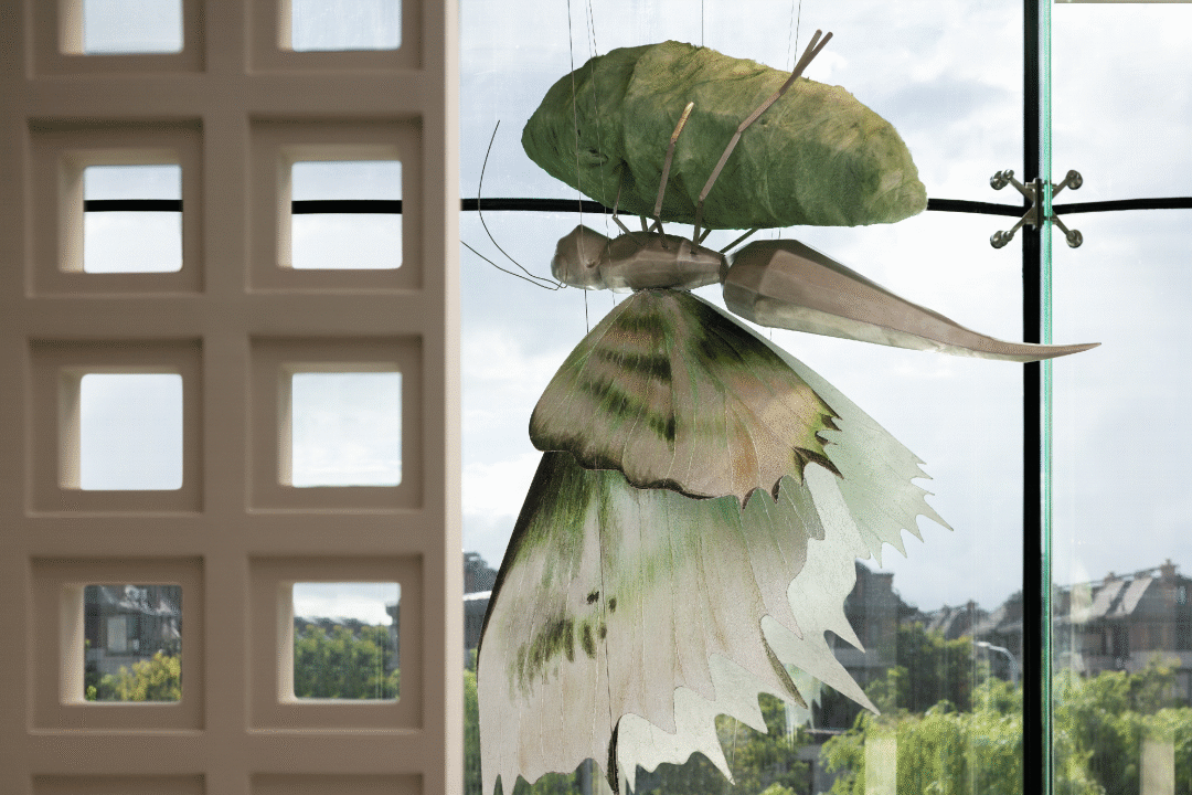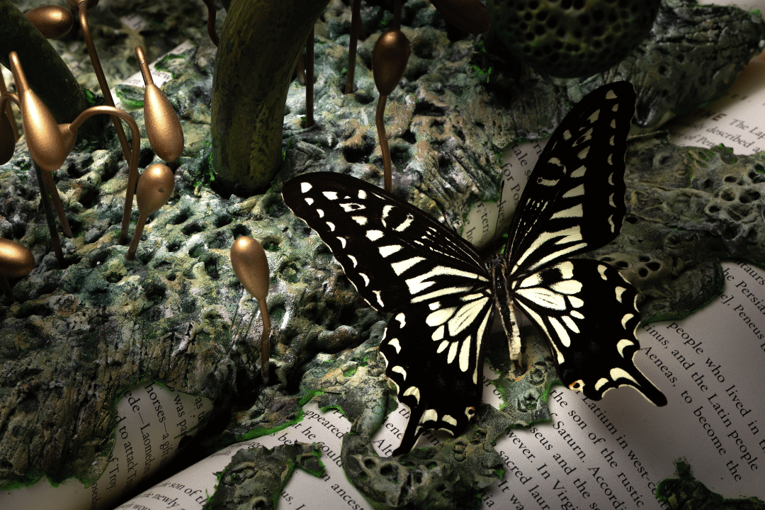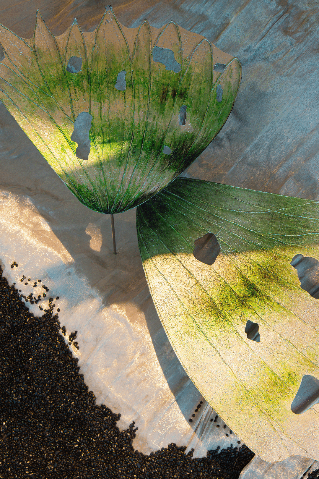 从破茧重生中衍生而来的大型蝴蝶装置,悬挂于沙盘区一侧,这来自于对自然生态问题的反思,同时也是整个空间生命力的象征。