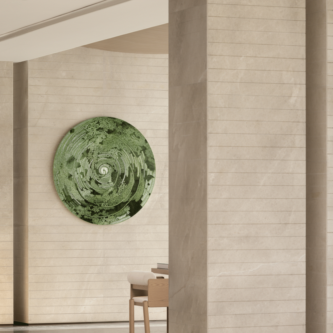 墙上圆形挂画是关于自然生态的艺术作品,自然的肌理脉络充盈整幅画面,变化万千的流动形态与韵律营造别一番风趣。