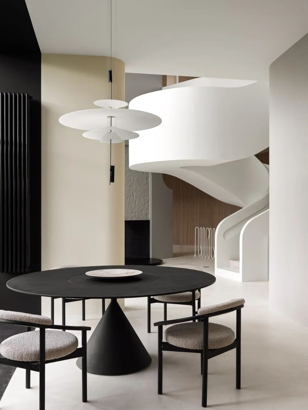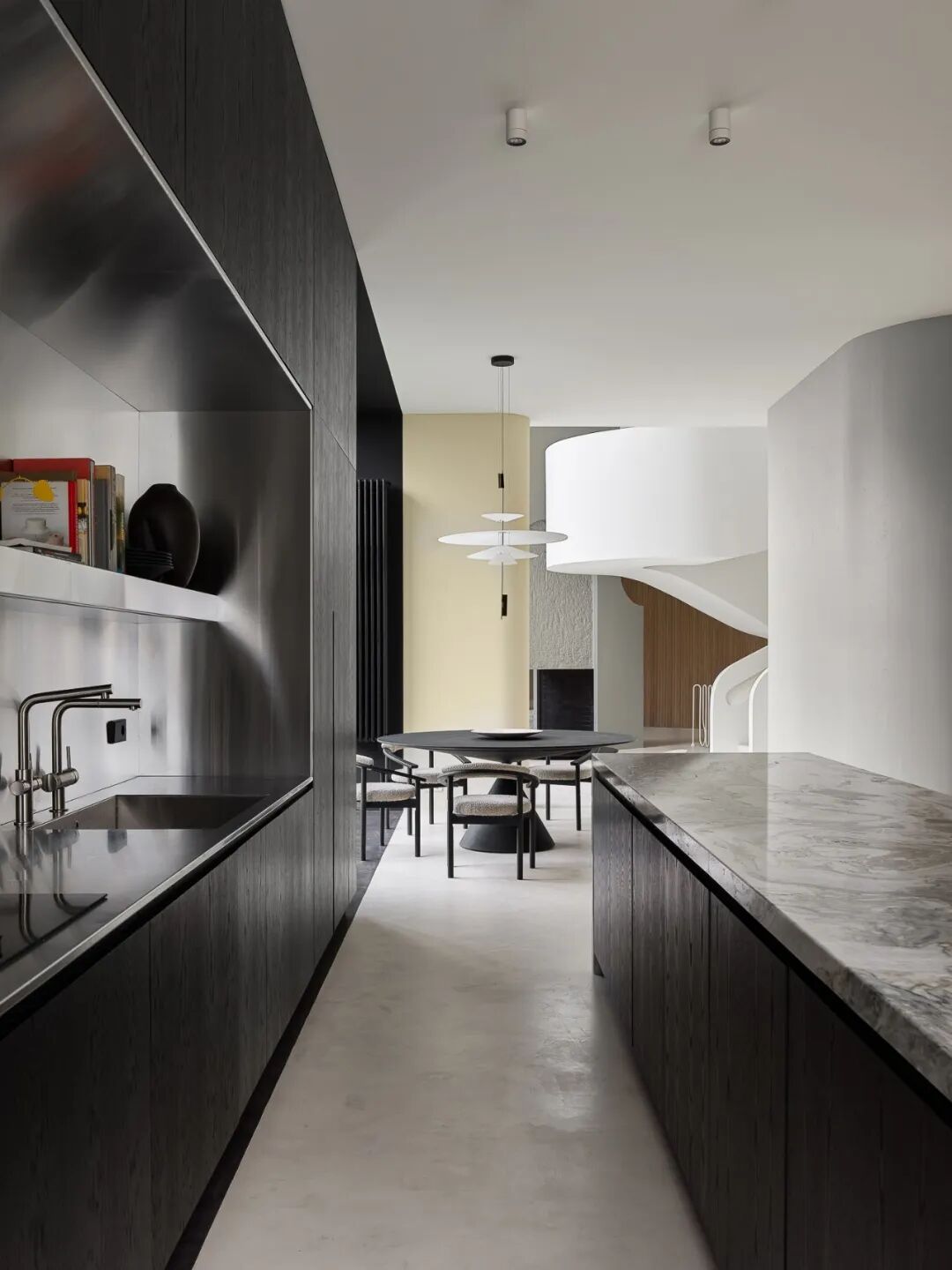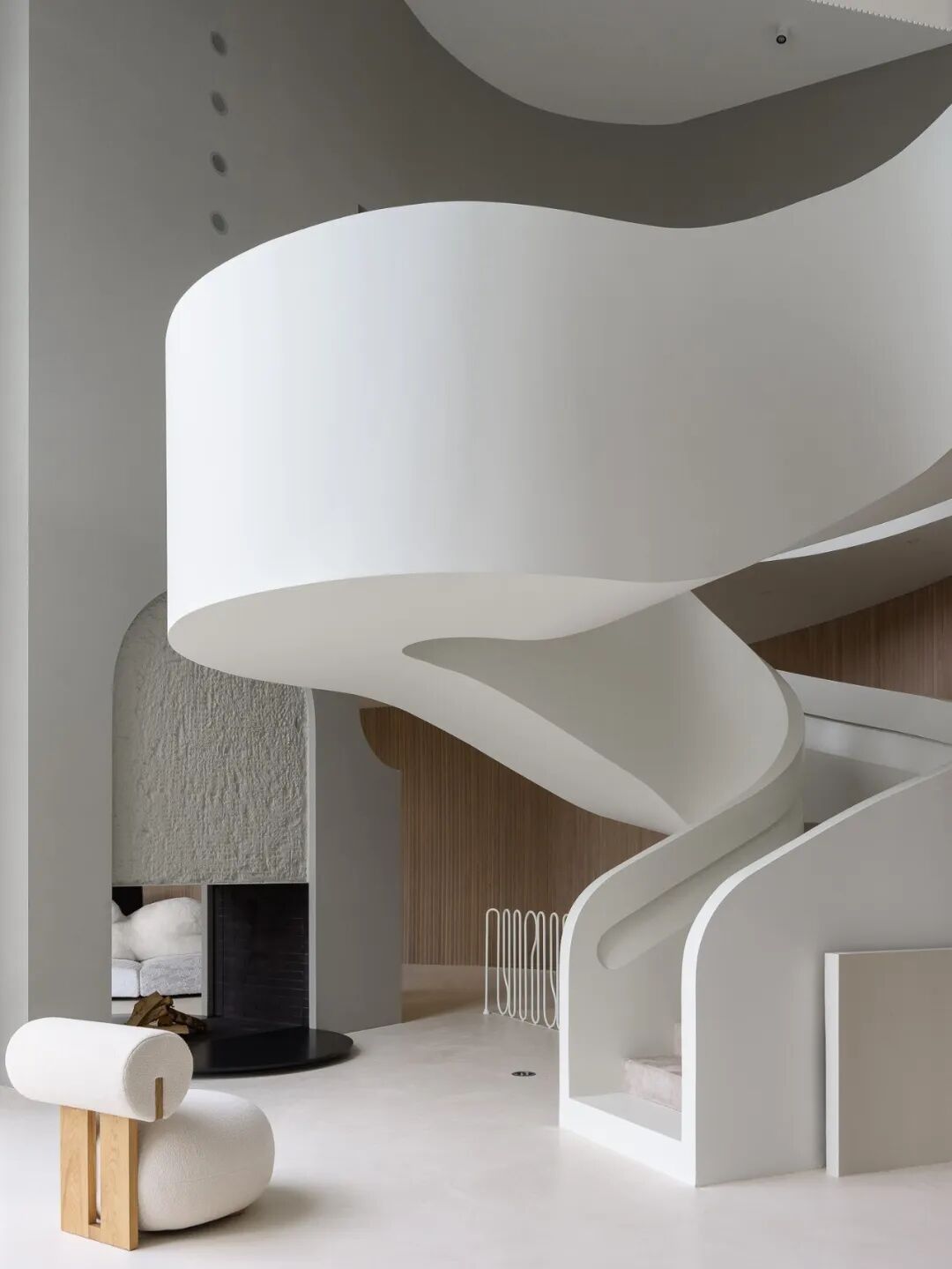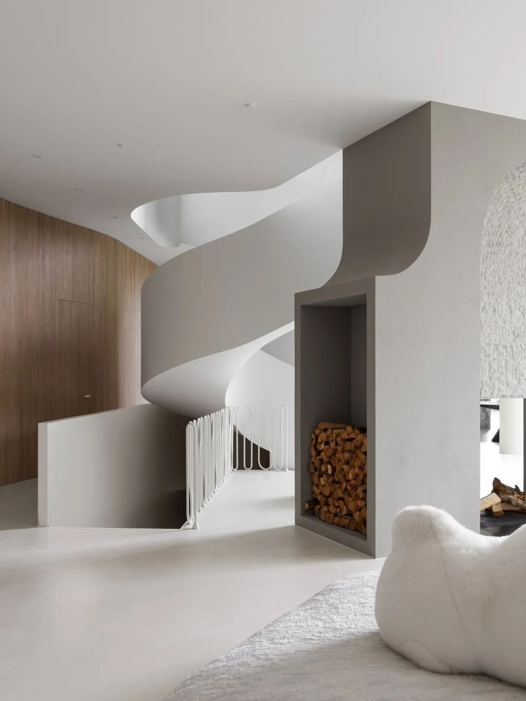 房子中央巨大的双光空隙激发了我们创造一个流动、优雅的楼梯的灵感。房子形状的棱角和锐利与内部形状和颜色的柔和形成鲜明对比。中央的壁炉向两侧开放,同时为楼梯走廊和带蓬松沙发的客厅供暖。