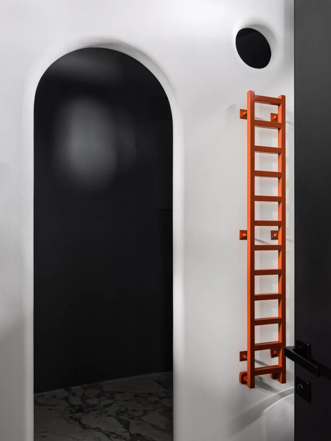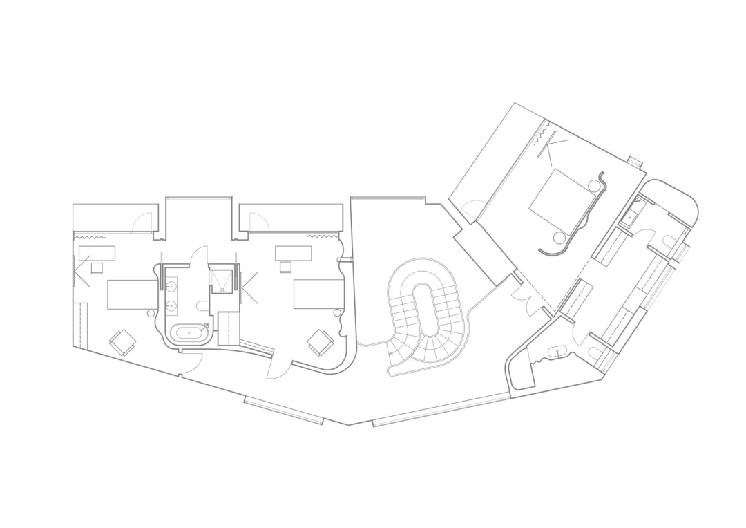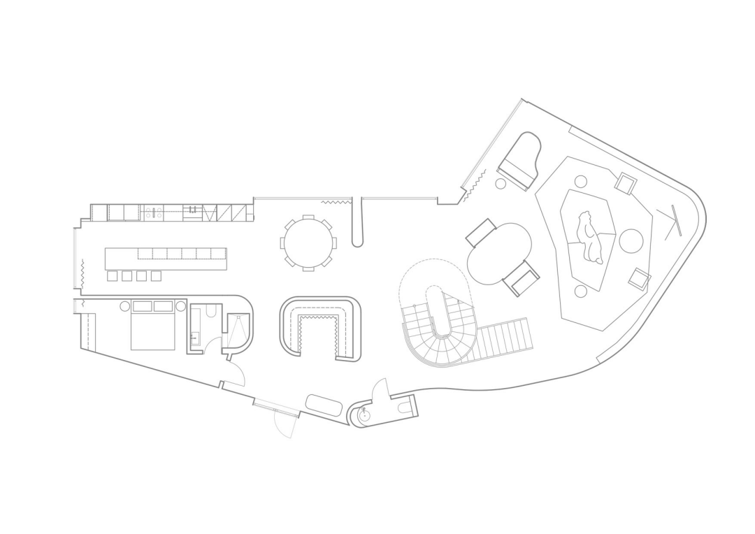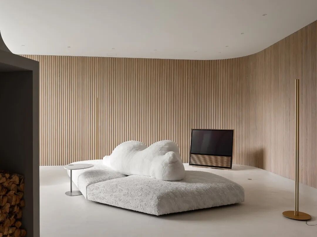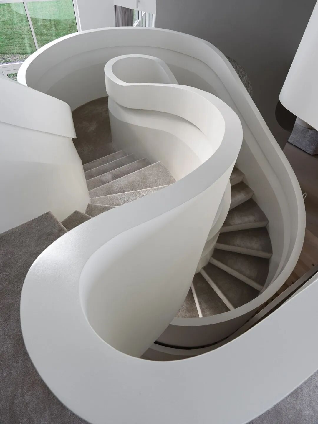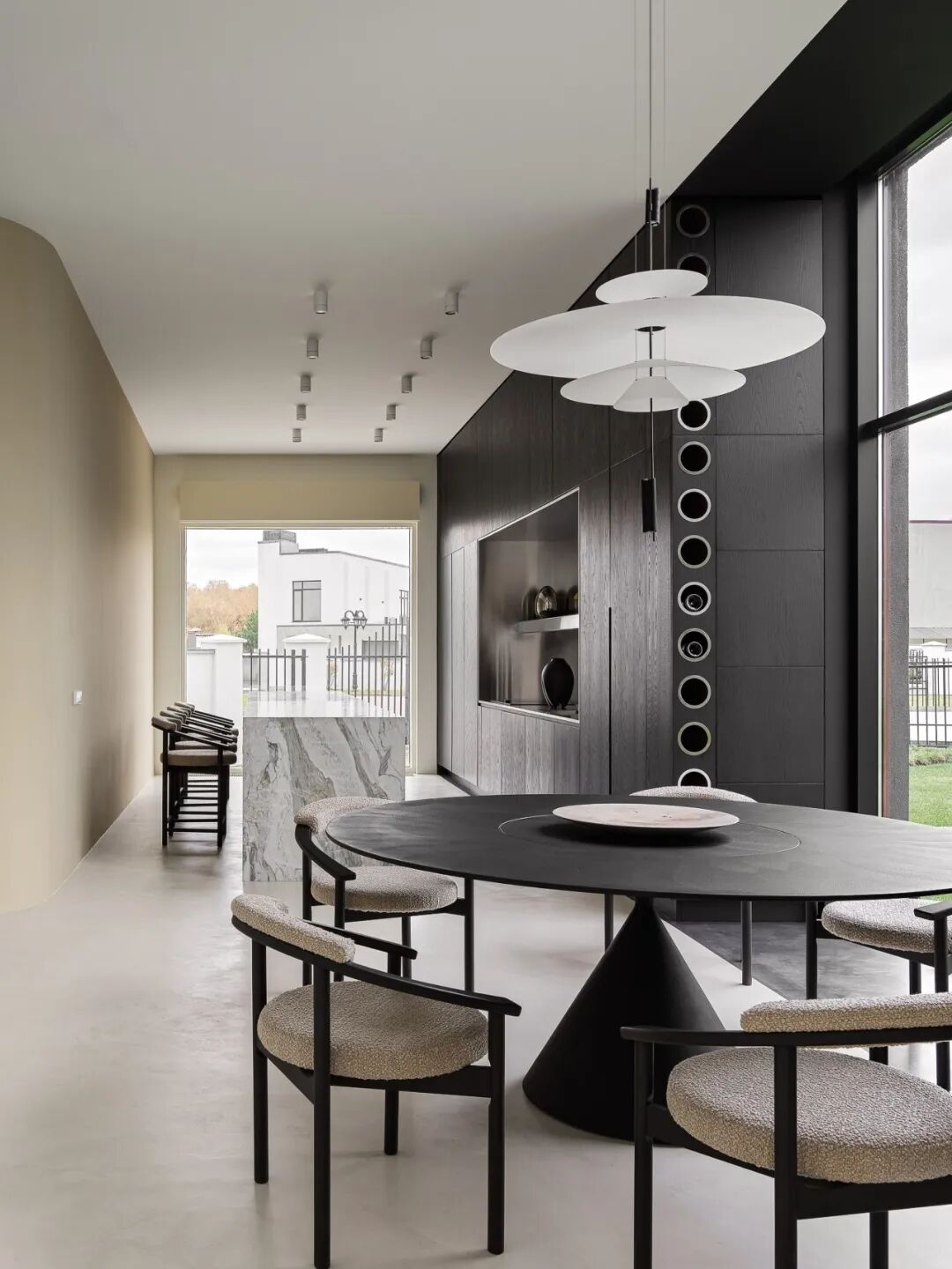 房子中央巨大的双光空隙激发了我们创造一个流动、优雅的楼梯的灵感。房子形状的棱角和锐利与内部形状和颜色的柔和形成鲜明对比。中央的壁炉向两侧开放,同时为楼梯走廊和带蓬松沙发的客厅供暖。
